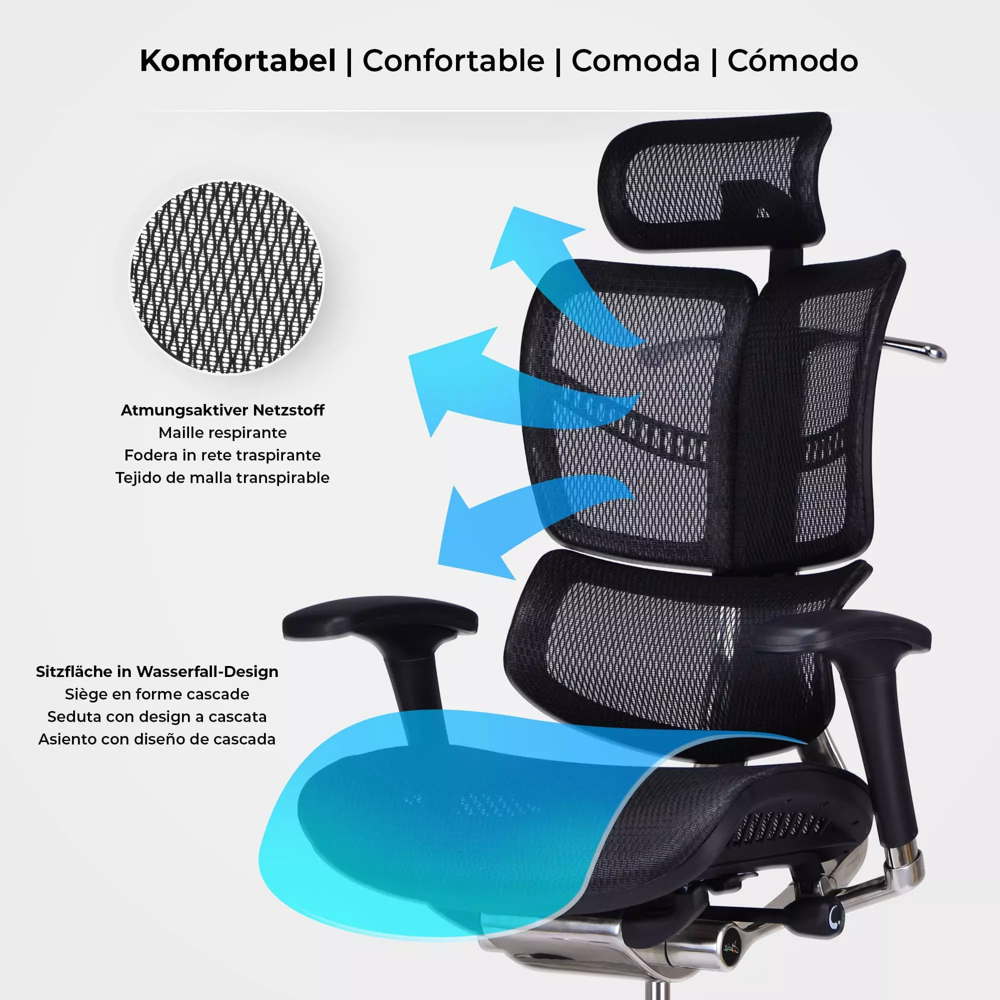 Die üppige Sitzfläche weist eine Krümmung auf, die die Belastung gleichmäßig auf Oberschenkel und Gesäß verteilt. Schließlich sorgen die 4D-Armlehnen für Entlastung der Schultern und Nackenpartie. 4D steht in diesem Zusammenhang für eine vierdimensionale Verstellbarkeit: Neben Höhen- und Tiefenverstellbarkeit sind die Armlehnen schwenkbar und in der Breite adjustierbar.