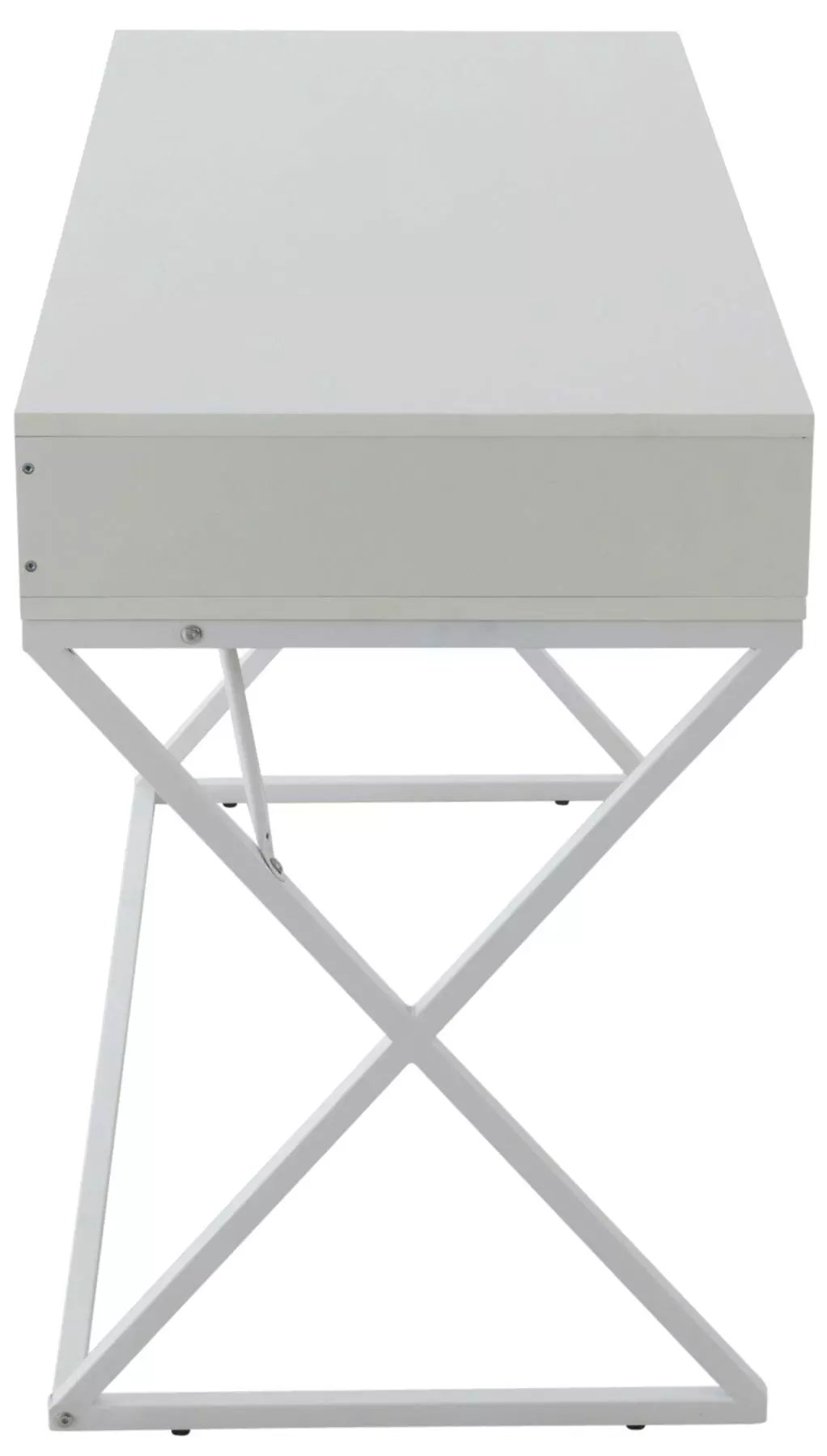 Unter der einladenden Arbeitsfläche bieten die grifflosen Schubladen genügend Stauraum für Ihre Unterlagen und Schreibutensilien. Der Korpus liegt dabei stabil und standsicher auf einem modernen Gestell aus weiß lackierten Stahlrohr. Des Weiteren ist der Tisch mit Kunststofffüßen ausgestattet die ein verkratzen des Bodens verhindern.