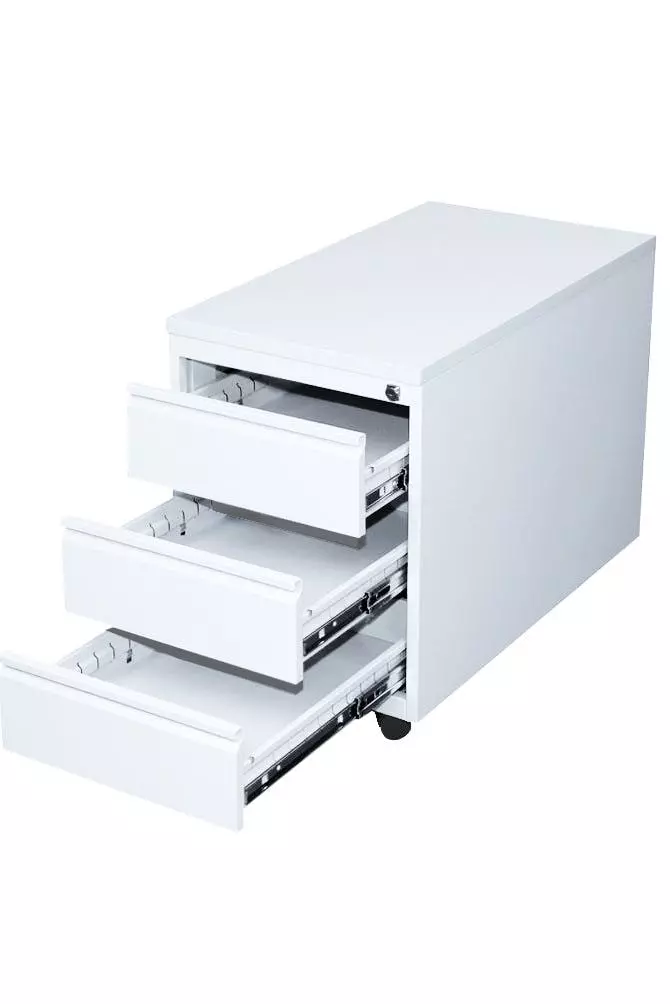 Stahl-Rollcontainer mit 3 Schubladen und durchgehender Frontgriffleisteseparater StifteauszugSchubladentiefe 550 mmAbschliessbar durch Zylinderschloss, inkl. 2 Schlüsseln. Führung in Teleskopschienen Gehäuse, Schubladen und Metallabdeckplatte sind pulverbeschichtet in RAL 7035. 4 Doppelrollen Maße: 610 x 460 x 790 mm (HxBxT)