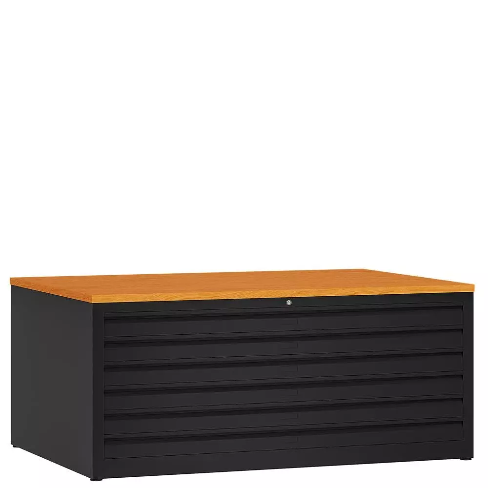 Hochwertiger Profi DIN-A0-Stahl-Zeichnungsschrank/ Flachablageschrank für DIN A0 Grafiken/Baupläne/Zeichnungen mit 6 Schubladen. Ideal geeignet für Architekten,Bauzeichner, Künstler, Sammler etc. Die Schubladen auf Präzisions-Teleskopführungen sind mit Auszugssperren versehen. Die durchgehende Griffleiste ermöglicht ein leichtes und angenehmes Öffnen der Schubladen. Die Schubladen sind zentral verschließbar durch ein Zylinderschloss inkl. 2 Schlüssel. Max. Schubladenauszug 700 mm. Der Schrank ist fertig montiert. Pulverbeschichteter Korpus und Schubladen, melaminharzbeschichtete Holz-Abdeckplatte. Maße: 605 x 1405 x 955 mm (Höhe x Breite x Tiefe) Material: Langlebige, geschweißte Stahlblechkonstruktion, melaminharzbeschichtete Holzabdeckplatte Farbe: Korpus: RAL 9005 Schwarz, Abdeckplatte: Buche Dekor