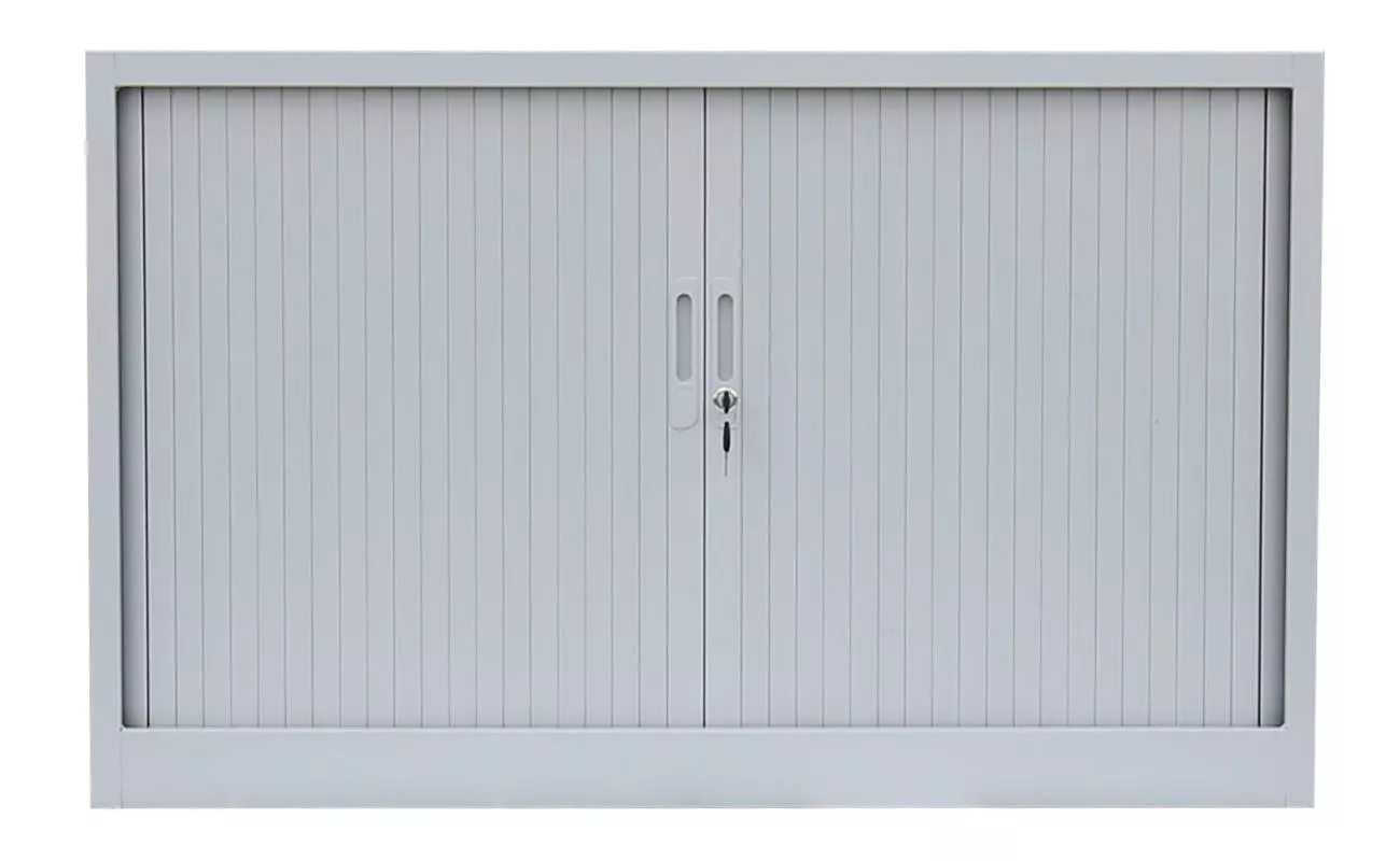 Rollladenschrank / Sideboard / Büro Aktenschrank Grau Langlebige, pflegeleichte, verschweißte Stahl-Konstruktion mit Kunststoff-Rollladentüren Optimal geeignet für enge Raumverhältnisse 2 Fachböden, 2,5 Ordnerhöhen Leichtläufige Kunststoff-Rollladentüren mit praktischen Griffmulden Fachböden im Raster höhenverstellbar Fachbodentragkraft bis 50 kg Fachböden serienmäßig in Korpusfarbe ausgeführt Bis 10 mm höhenverstellbare Bodengleiter zum Niveauausgleich Hakenriegelschloss inkl. 2 Schlüssel Korpus elektrostatisch, glatt pulverbeschichtet Qualität und SicherheitLieferung: Komplett verschweißt, keine Montage erforderlich, nur Böden müssen eingelegt werden Maße: 1050 x 1200 x 460 mm (HxBxT)Farbe: Korpus in RAL 7035 Lichtgrau, Türen in Lichtgrau