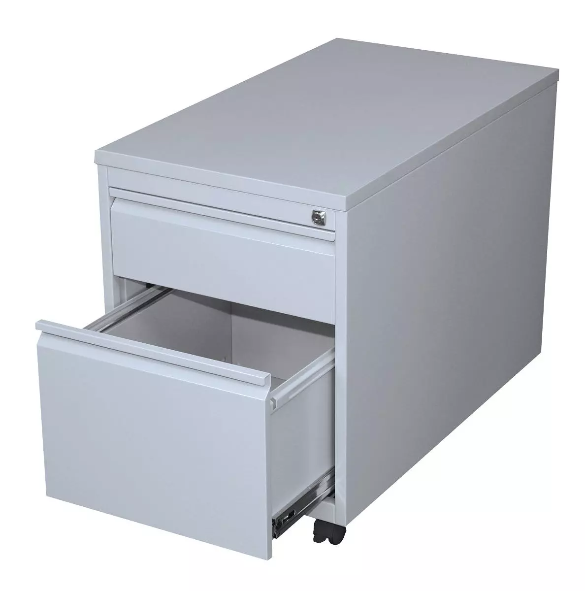 Stahl-Rollcontainer mit 1 Schublade und 1 Hängeregistratur-Auszug jeweils mit Frontgriff. Abschließbar mit Zylinderschloss, inkl. 2 Schlüsseln Schubladenführung auf TeleskopschienenSchubladentiefe 550 mmKorpus, Front und Metallabdeckplatte pulverbeschichtet in RAL 7035 LichtgrauMaße: 610 x 460 x 790 mm (HxBxT)