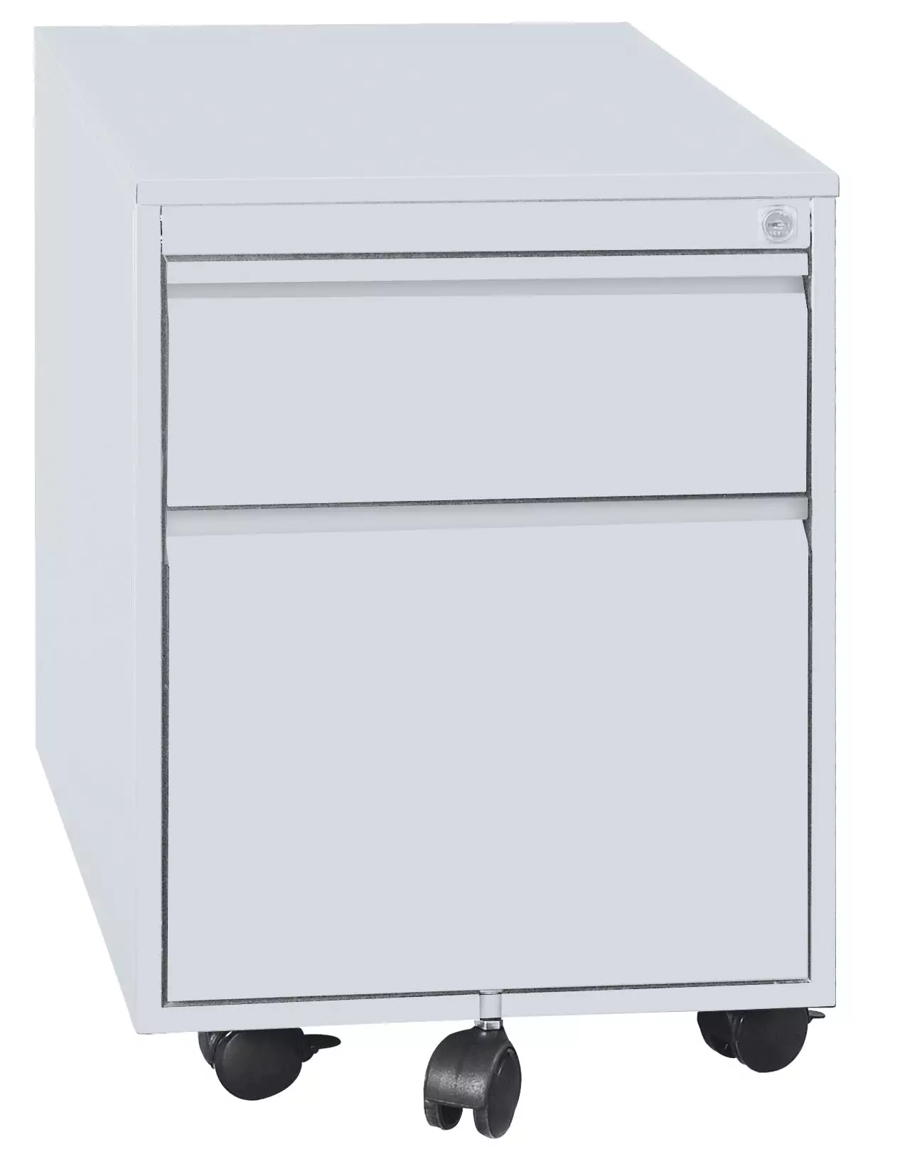 Stahl-Rollcontainer mit 1 Schublade und 1 Hängeregistraturauszug jeweils mit durchgehender Frontgriffleisteseparater Stifteeinsatz, verschließbar durch Zylinderschloss, inkl. 2 Schlüssel. Führung der Laden in Teleskop-Schienen, Schubladentiefe 530 mm, Gehäuse, Schubladen und Stahl-Abdeckplatte pulverbeschichtet in RAL 7035 Lichtgrau, 4 Doppelrollen, Maße: 550 x 400 x 590 mm (H x B x T).
