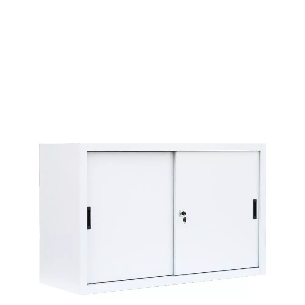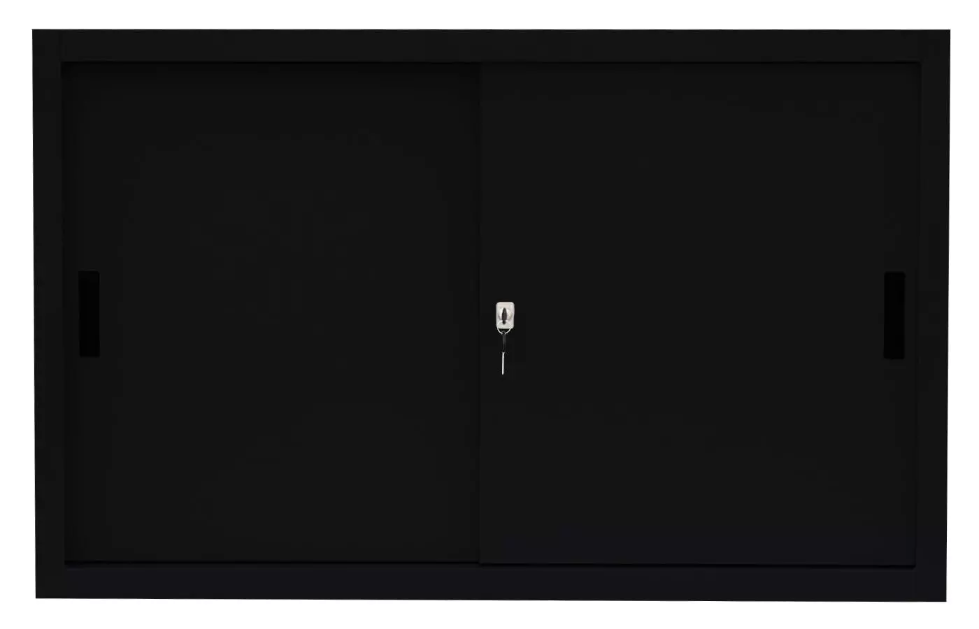 Hochwertiger Profi Stahl-Schiebetürenschrank/Sideboard 120 cm breit für Ihr Home Office oder im professionellen Büro-Einsatz. Langlebige, pflegeleichte, verschweißte Stahl-Konstruktion Optimal geeignet für enge Raumverhältnisse 1 Fachboden, 2 Ordnerhöhen Leichtläufige Schiebetüren in Schienenführung mit Kugellagerrollen und praktischen Griffmulden Serienmäßig mit geräuschdämpfenden Anschlagspuffern Fachböden im Raster höhenverstellbar Fachbodentragkraft bis 50 kg Fachböden serienmäßig in Korpusfarbe ausgeführt Bis 10 mm höhenverstellbare Drehfüße zum Niveauausgleich Dreh-Druckzylinderschloss inkl. 2 Schlüssel Korpus und Schubladen elektrostatisch, glatt pulverbeschichtet Qualität und Sicherheit Komplett verschweißt, keine Montage erforderlich Maße: 750 x 1200 x 450 mm (HxBxT) Farbe: Korpus in RAL 9005 Schwarz, Türen in RAL 9005 Schwarz