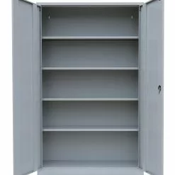 XXXL Stahl-Aktenschrank „Koloss“ mit einer Breite von 120cm und einer Tiefe von 60cmLanglebige, pflegeleichte, verschweißte Stahl-Konstruktion 4 Fachböden, 5 Ordnerhöhen Schranktüren jeweils rechts und links angeschlagen, an gefederten Stiftscharnieren befestigt, mittig schließend Kastenverstärkung für eine erhöhte Türstabilität Flexible Nutzung als Aktenschrank oder Regal durch herausnehmbare Flügeltüren Geräuschdämpfende Kunststoff-Türanschlagspuffer serienmäßig Individuelle, flexible Innen-Einteilung durch höhenverstellbare Einlegeböden, im 5 cm-Raster Tragkraft der herausnehmbaren Einlegeböden bis zu 65 kg Einlegeböden serienmäßig in Korpusfarbe ausgeführt 2-Wege-Schubstangenzylinderschloss mit Drehgriff, inkl. 2 Schlüssel Korpus und Türen elektrostatisch, glatt pulverbeschichtet Qualität und Sicherheit Komplett verschweißt, keine Montage erforderlich, nur Fachböden müssen eingelegt werden Maße: 1950 x 1200 x 600 mm (HxBxT)