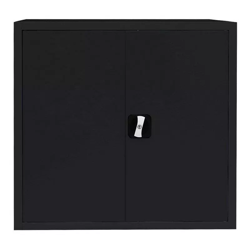Aktenschrank, Büroschrank, Aktenschrank Metall, Ordnerschrank, Lagerschrank, Werkzeugschrank, mit 1x Fachboden (2 Ordnerhöhen).Universell einsetzbar zur Lagerung und Ablage von Aktenordnern und Dokumenten, zum sicheren Aufbewahren (abschließbar durch Schubstangen-Zylinderschloss) und Lagern von Werkzeug, Aufbewahrungsboxen, Verkaufsunterlagen, Katalogen, Papier und Schreibmaterial. Ideal geeignet für Büros, Logistik, Lager, Werkstätten sowie für den Privatgebrauch im Keller oder in der Garage 1 Fachboden, 2 OrdnerhöhenMaße: 750 x 800 x 383 mm (HxBxT)Schranktüren jeweils rechts und links angeschlagen, an gefederten Stiftscharnieren befestigt, mittig schließendKastenverstärkung für eine erhöhte Türstabilität Flexible Nutzung als Aktenschrank oder Regal durch herausnehmbare Flügeltüren Geräuschdämpfende Kunststoff-Türanschlagspuffer serienmäßig Individuelle, flexible Innen-Einteilung durch höhenverstellbare Einlegeböden, im 5 cm-Raster Tragkraft der herausnehmbaren Einlegeböden bis zu 65 kg Einlegeböden serienmäßig in Korpusfarbe ausgeführt 2-Wege-Schubstangenzylinderschloss mit Drehgriff, inkl. 2 Schlüssel Korpus und Türen elektrostatisch, glatt pulverbeschichtet Qualität und Sicherheit Langlebige, pflegeleichte, verschweißte Stahl-Konstruktion Komplett verschweißt, keine Montage erforderlich, nur Fachböden müssen eingelegt werdenFarbe: Korpus: Schwarz, Türen: Schwarz