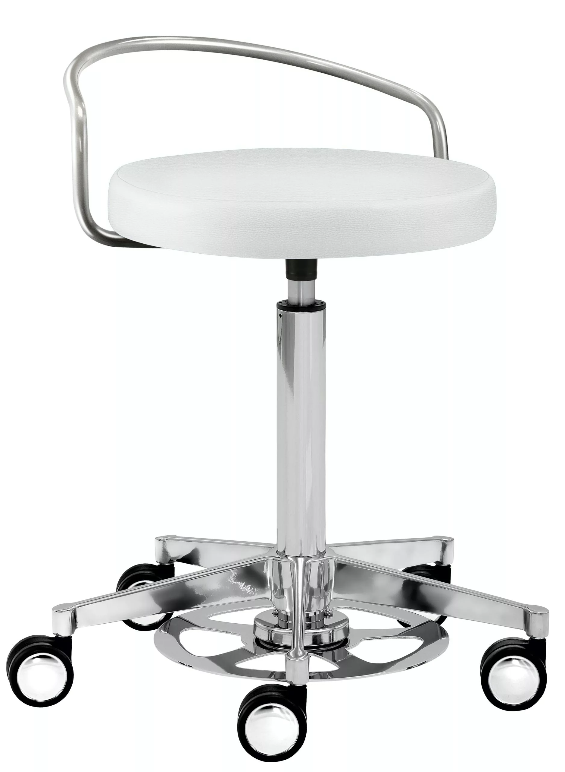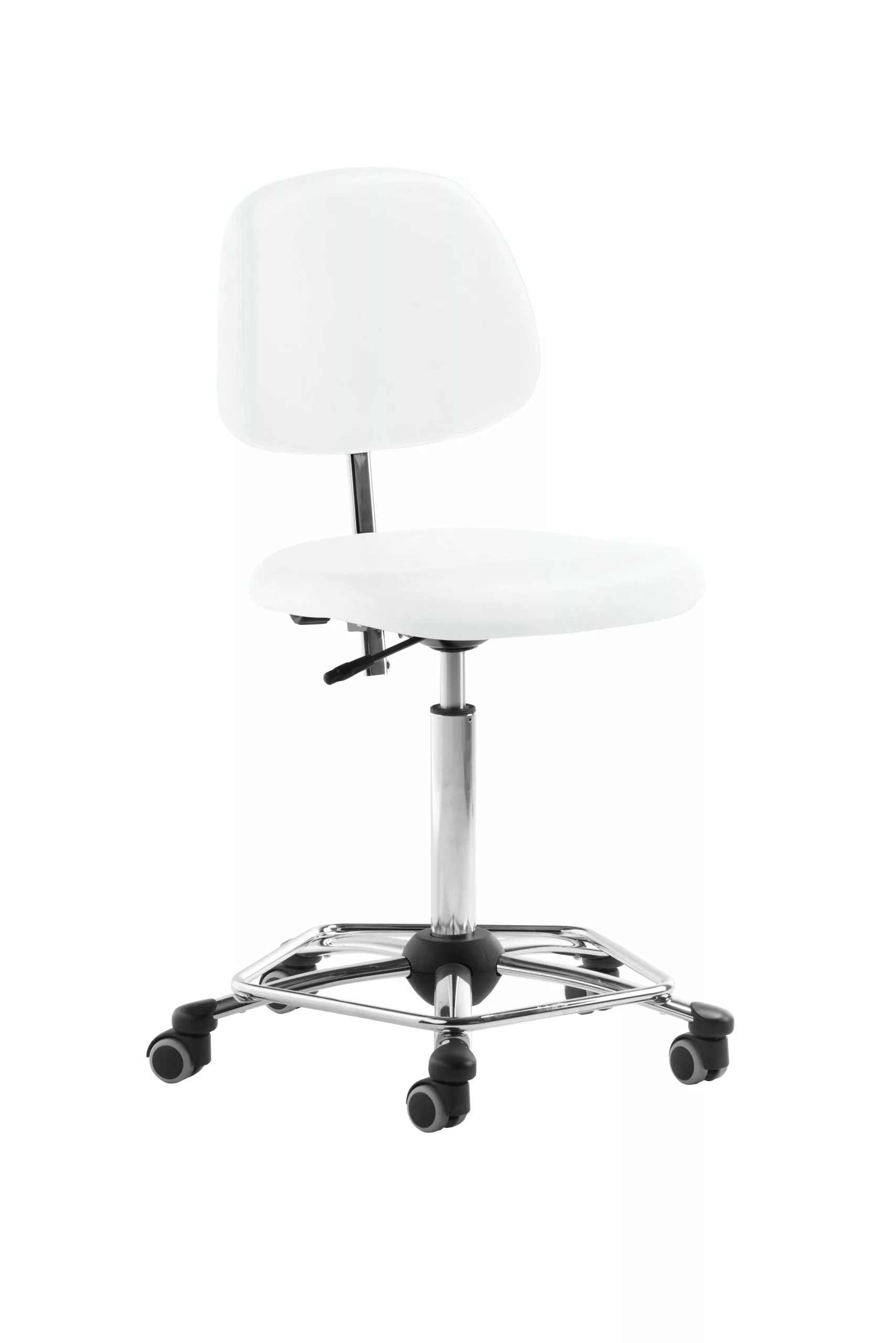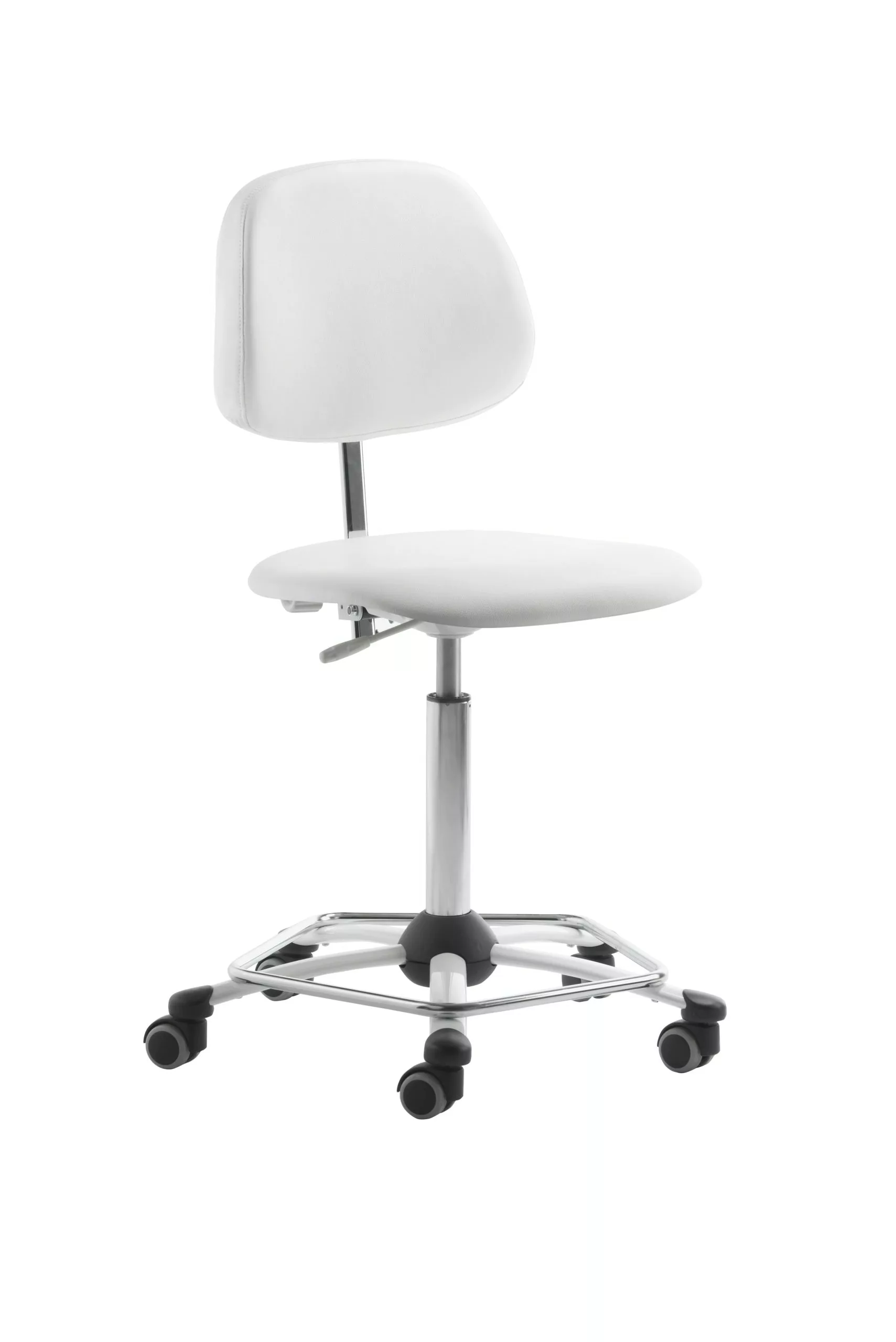 Gestell weiß, Sitz und Rücken gepolstert, Standard-Mechanik, Rücken in Höhe und Neigung variabel verstellbar, stufenlose Höhenverstellung durch Gasfeder, Fußring verchromt, inkl. Rollen für Hartböden, Sitzhöhe 49 – 69 cm.