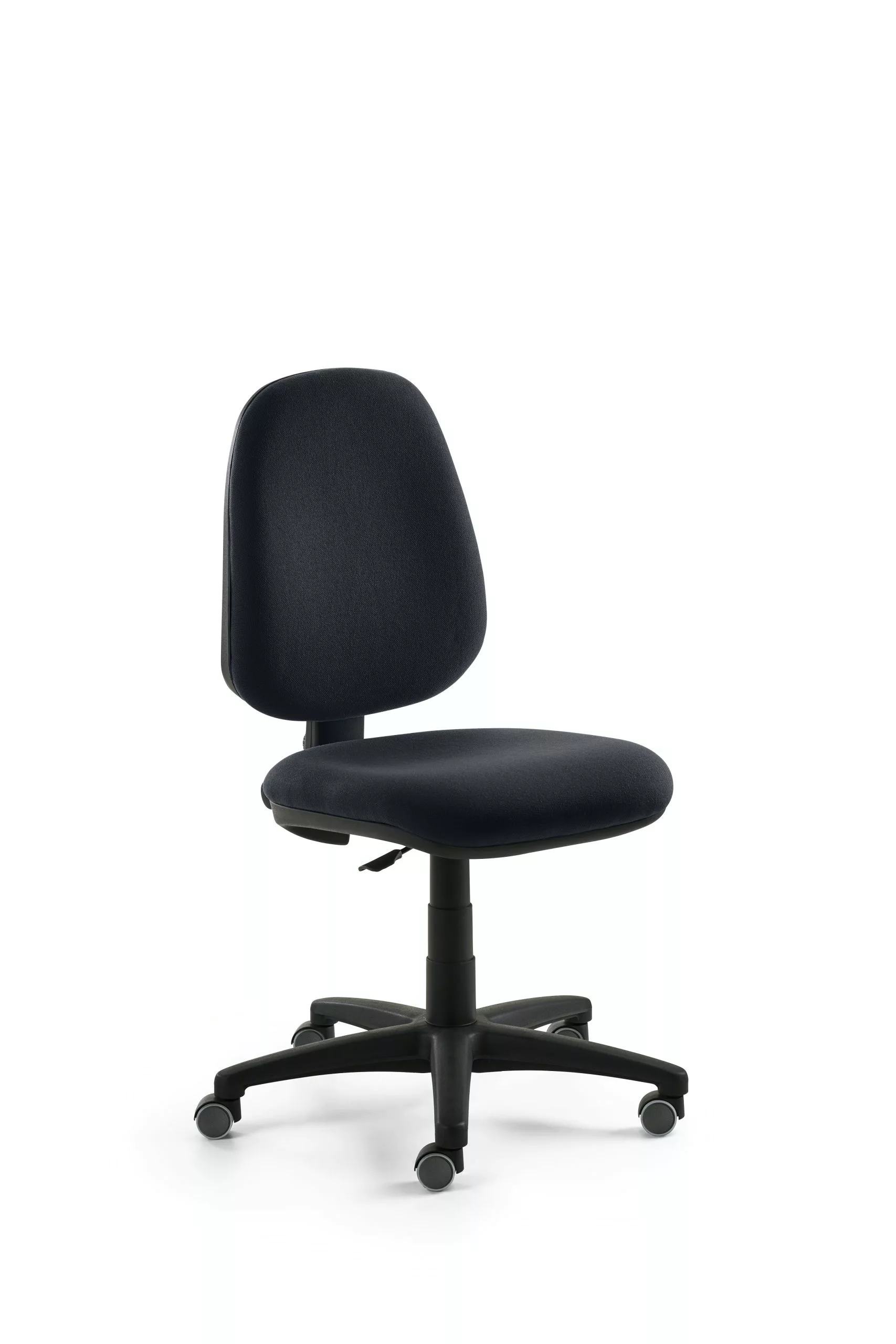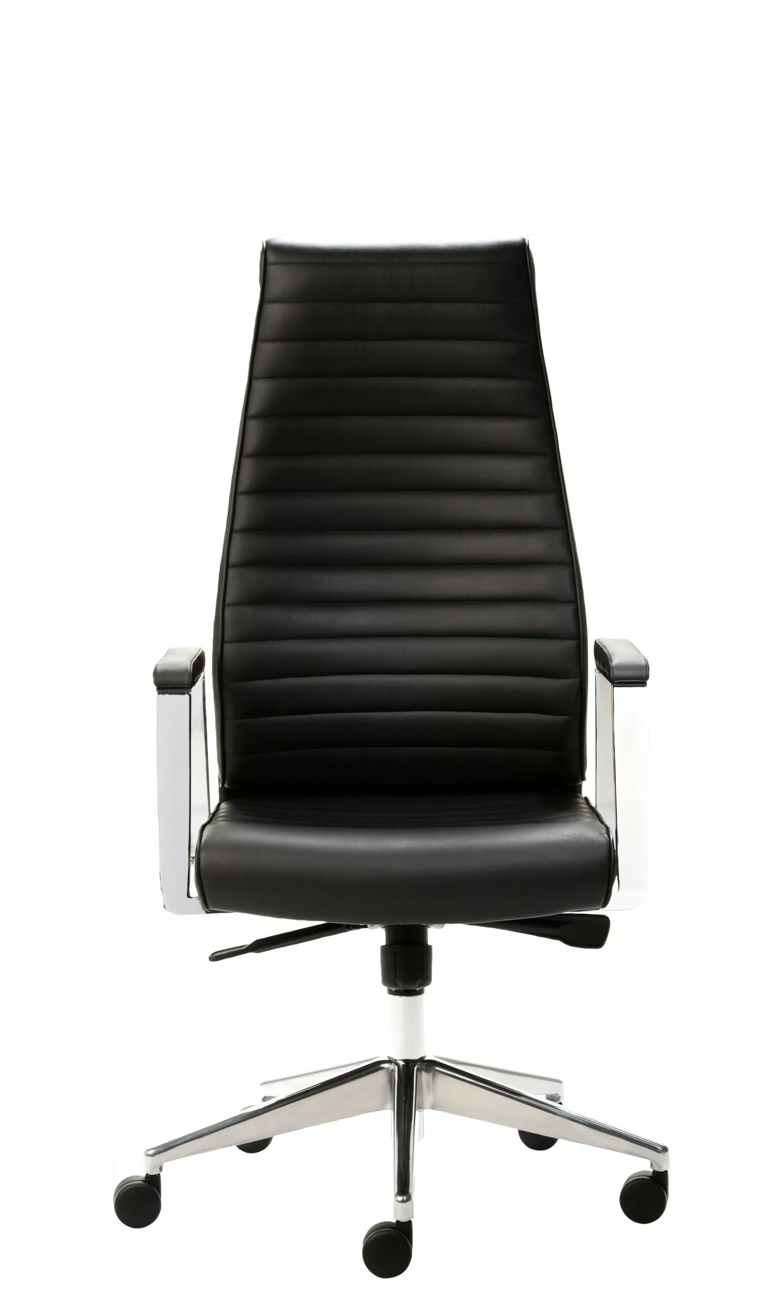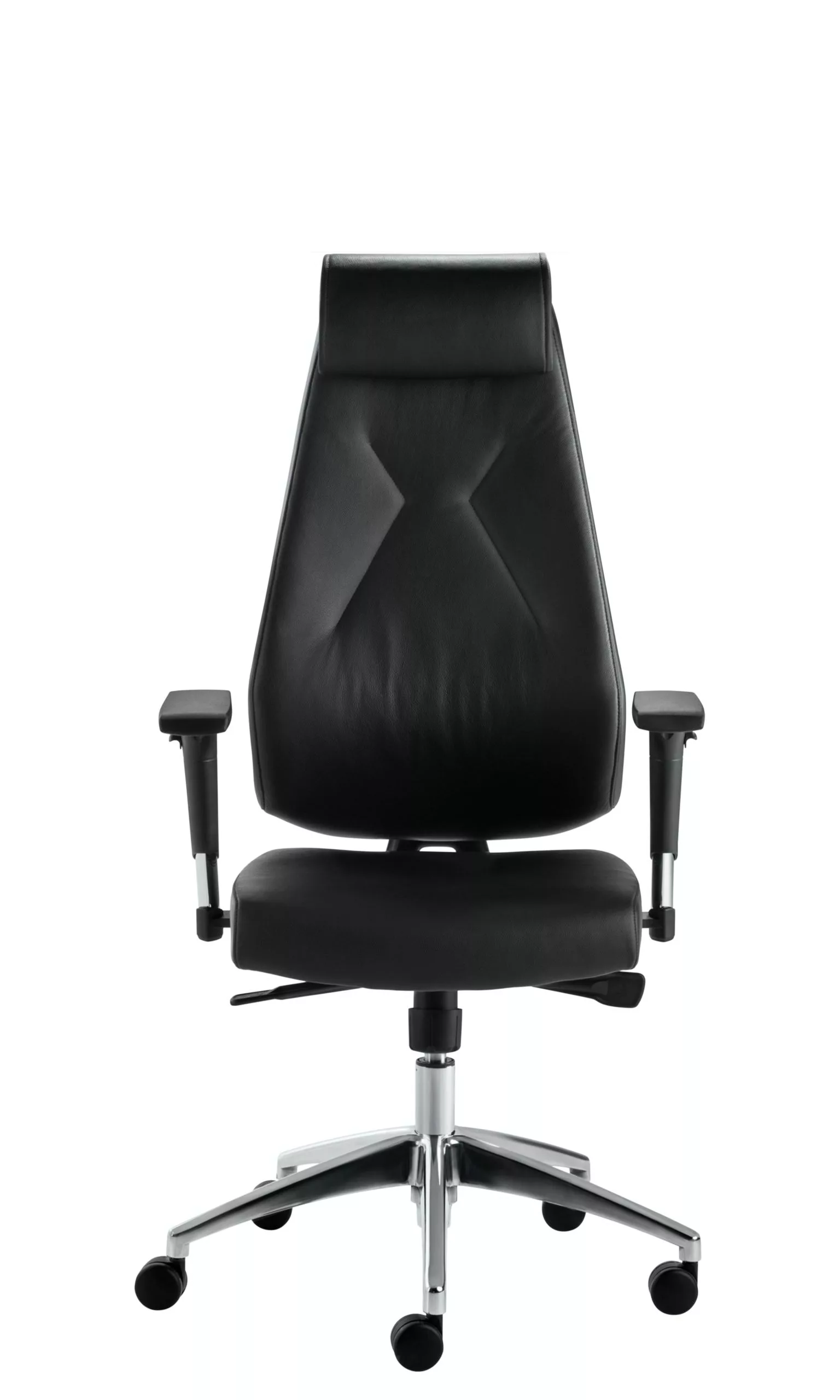 Vorderseite Echtleder schwarz, Armlehnen höhenverstellbar, Synchronmechanik mit individueller Gewichtseinstellung, stufenlose Höhenverstellung durch Gasfeder, Alu-Fußkreuz poliert, inkl. große Rollen für Teppichböden, Sitzhöhe 47 – 59 cm.