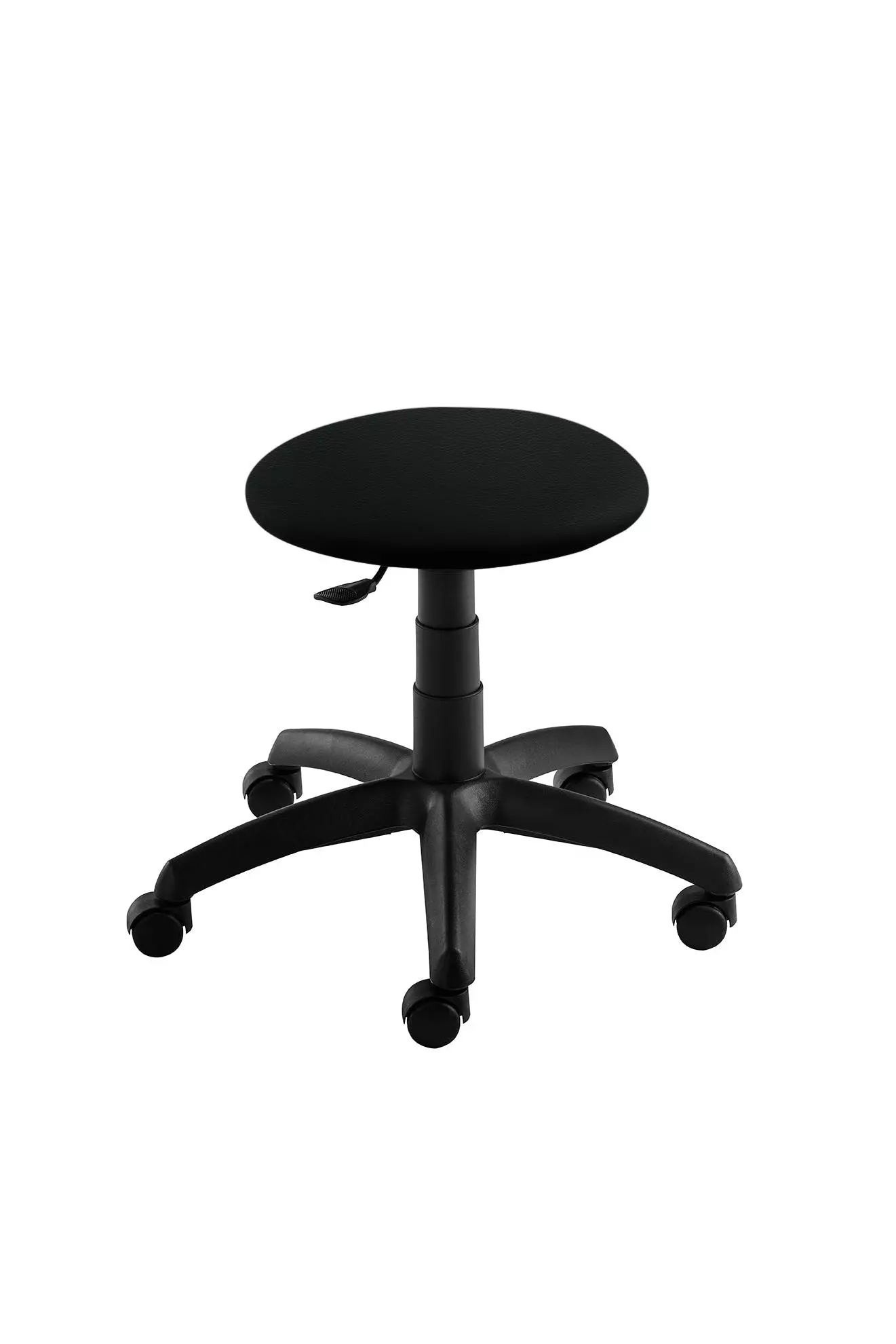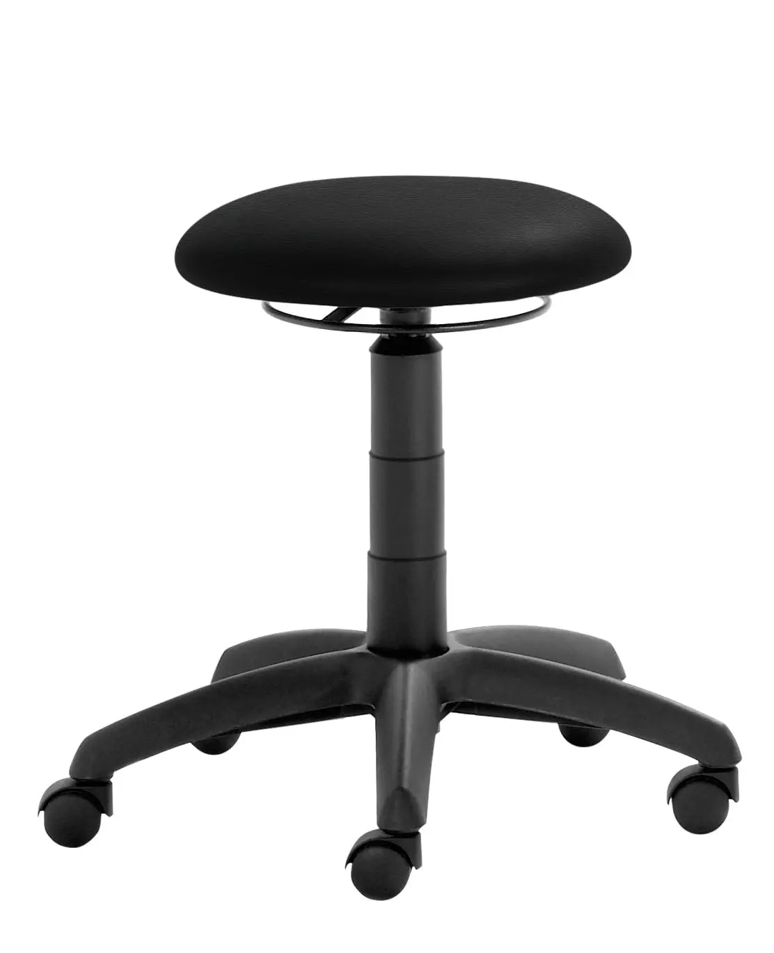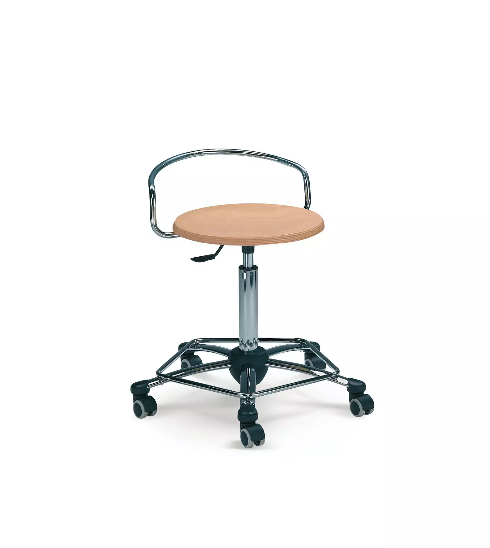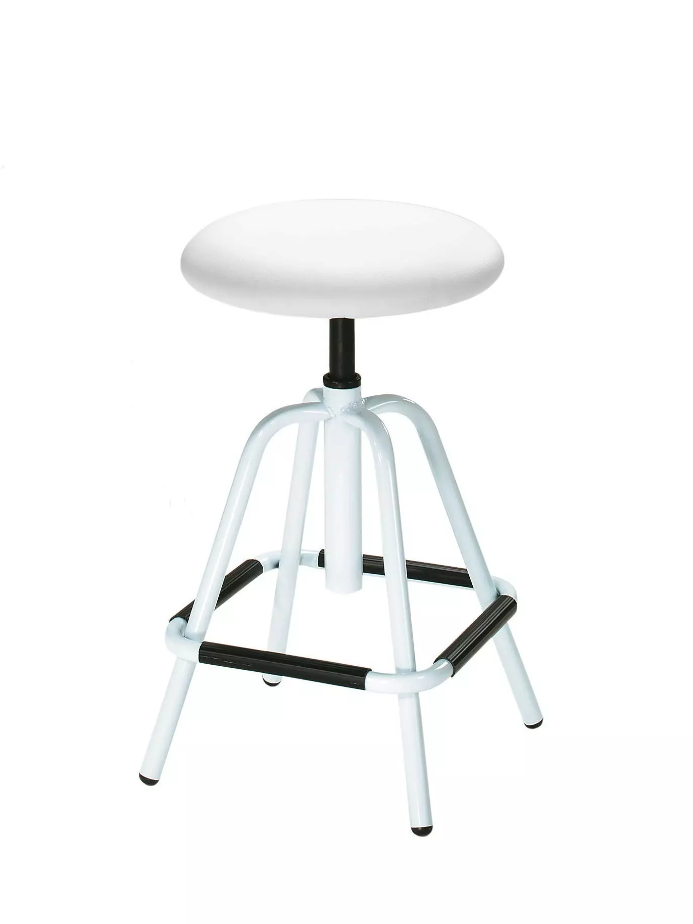 Gestell weiß, Spindel-Höhenverstellung, Muldensitz Buche massiv, natur lackiert, Sitzhöhe 56 – 73 cm.