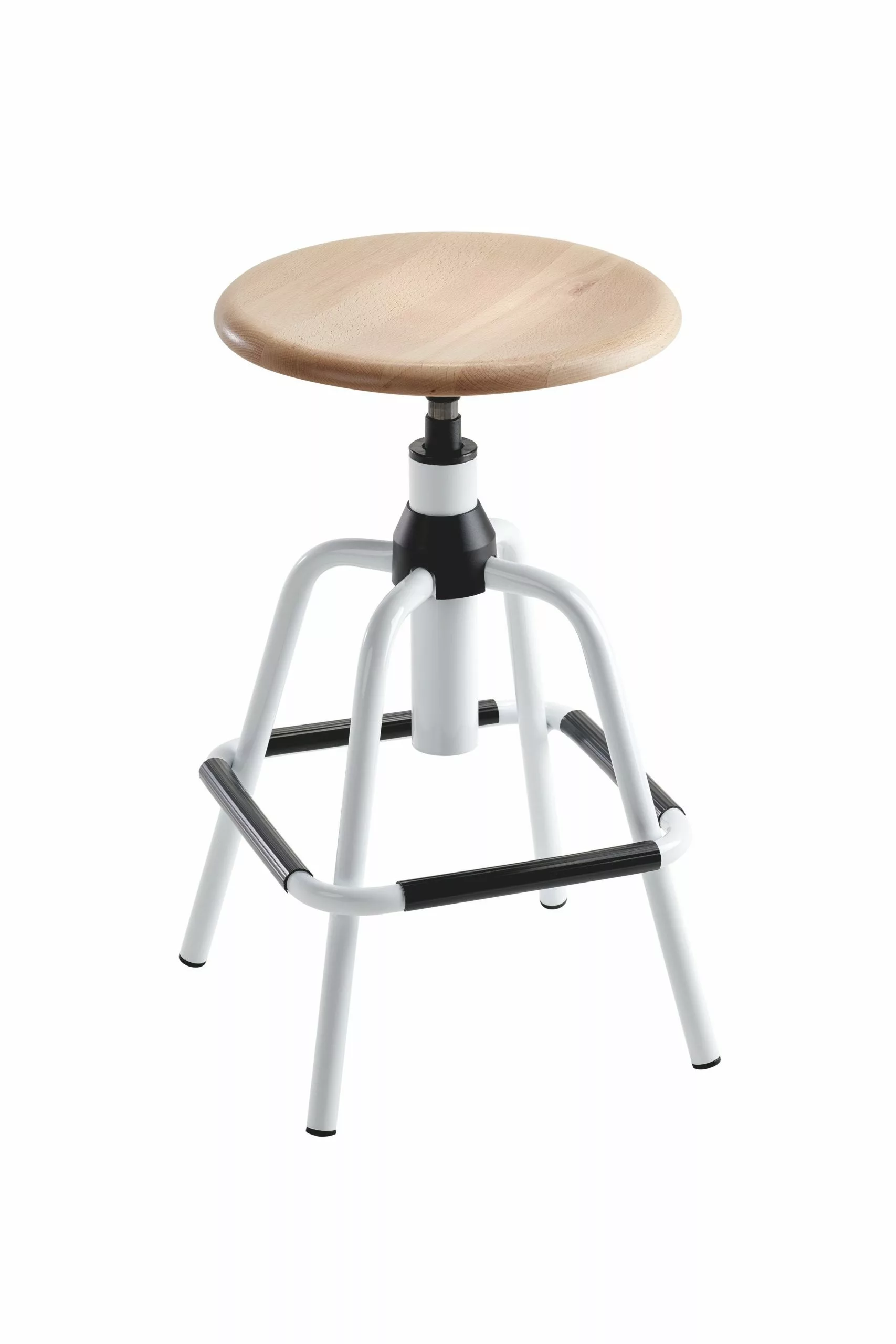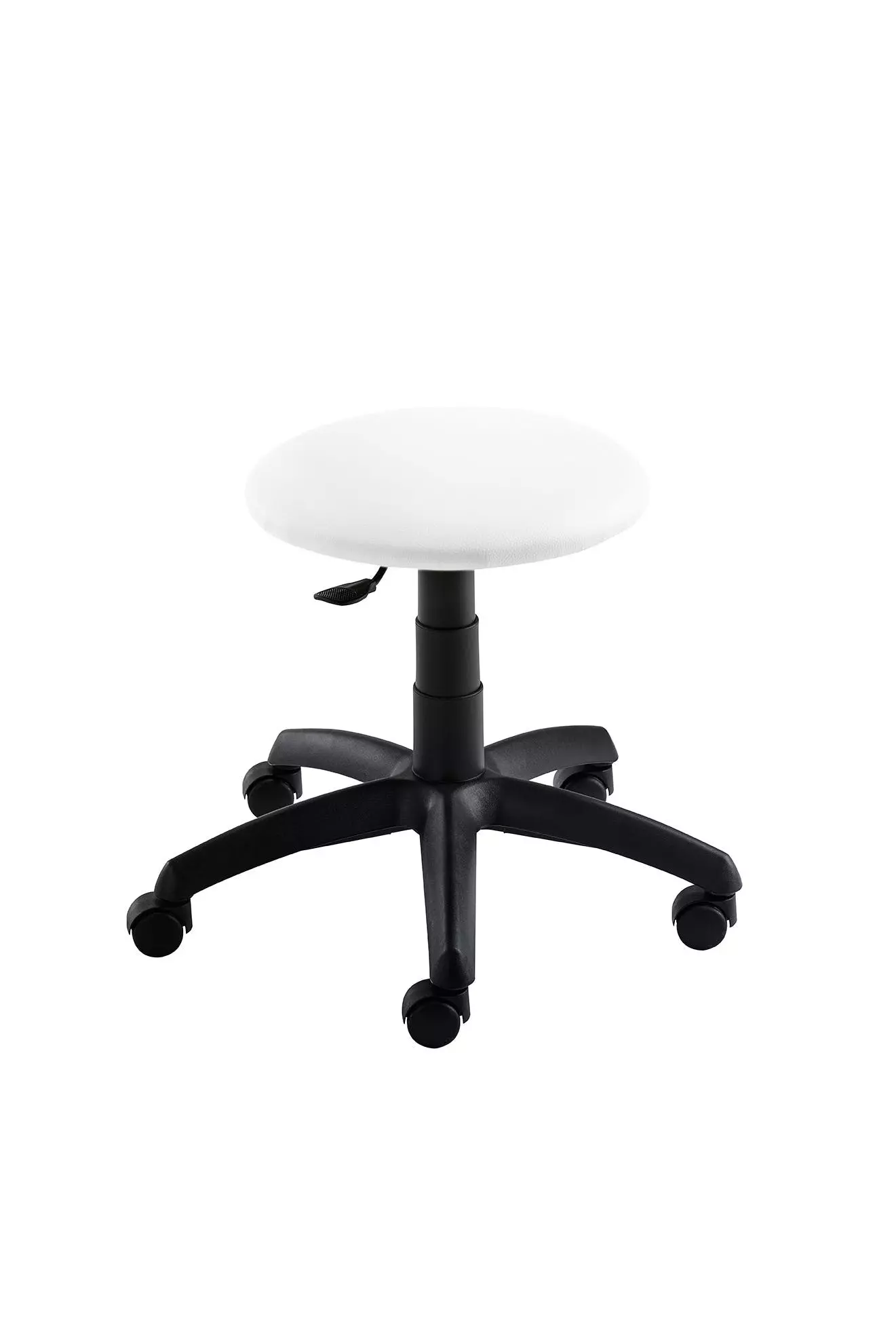 Gestell weiß, Spindel-Höhenverstellung, Sitz gepolstert, Sitzhöhe 56 – 73 cm.