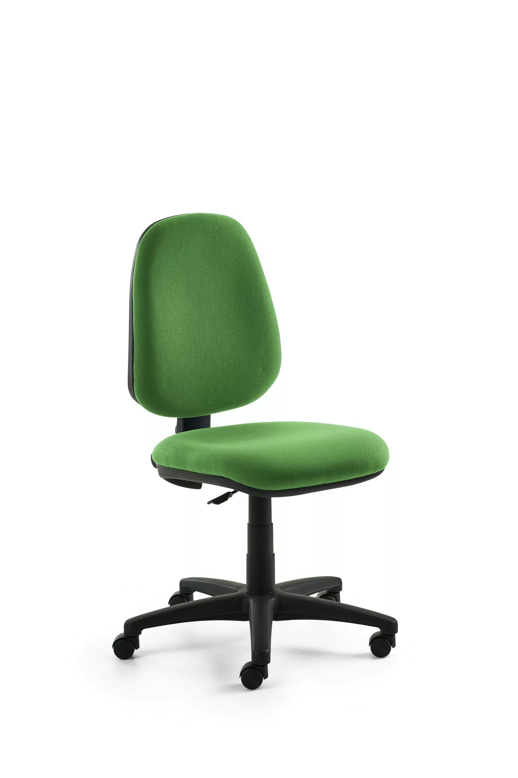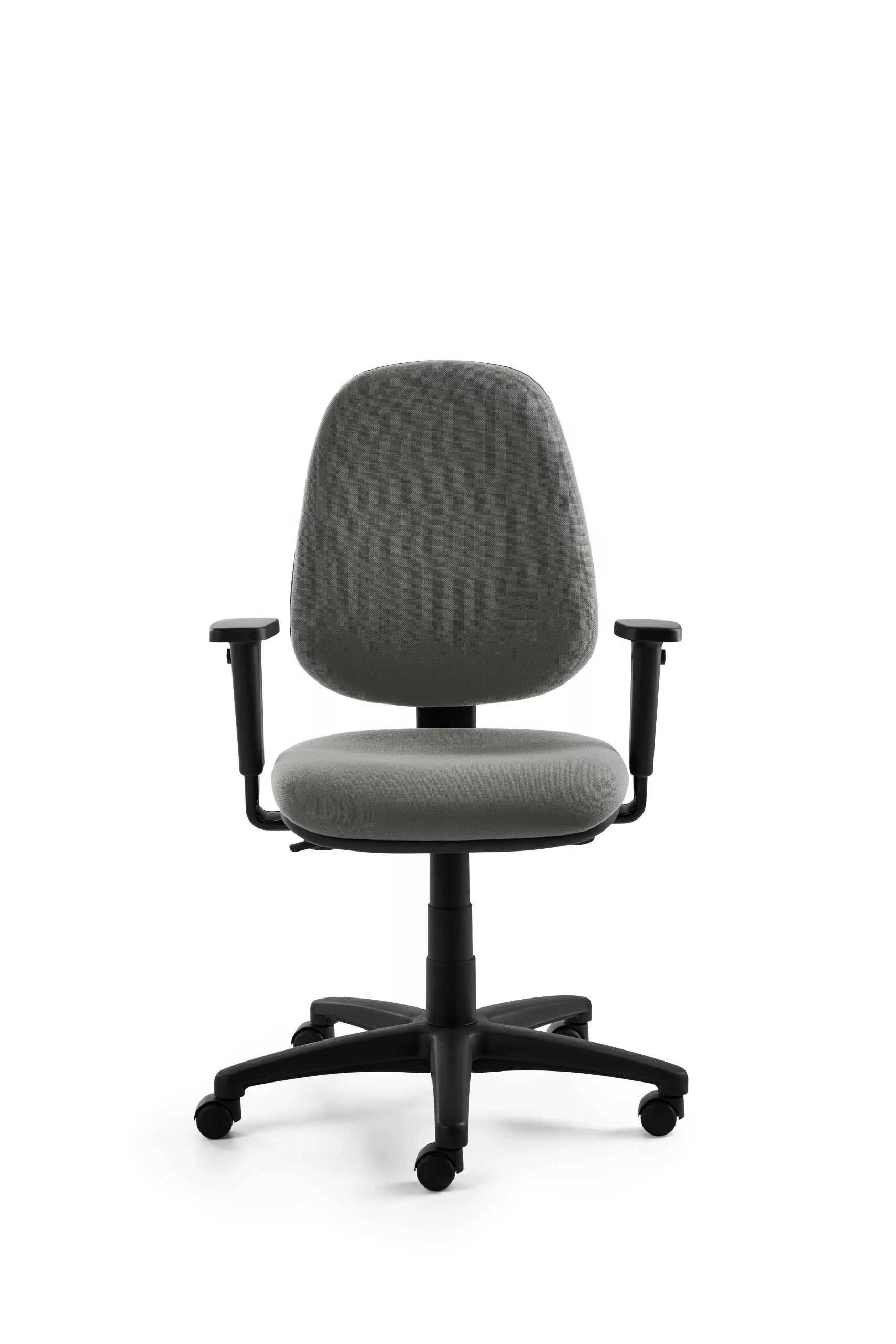 Gestell schwarz, mittlerer Rücken, Standard-Mechanik, Rücken in Tiefe und Höhe verstellbar, stufenlose Höhenverstellung durch Gasfeder, 360° drehbar, Kunststoff-Fußkreuz schwarz, inkl. Rollen für Teppichboden, Sitzhöhe 42 – 53 cm.