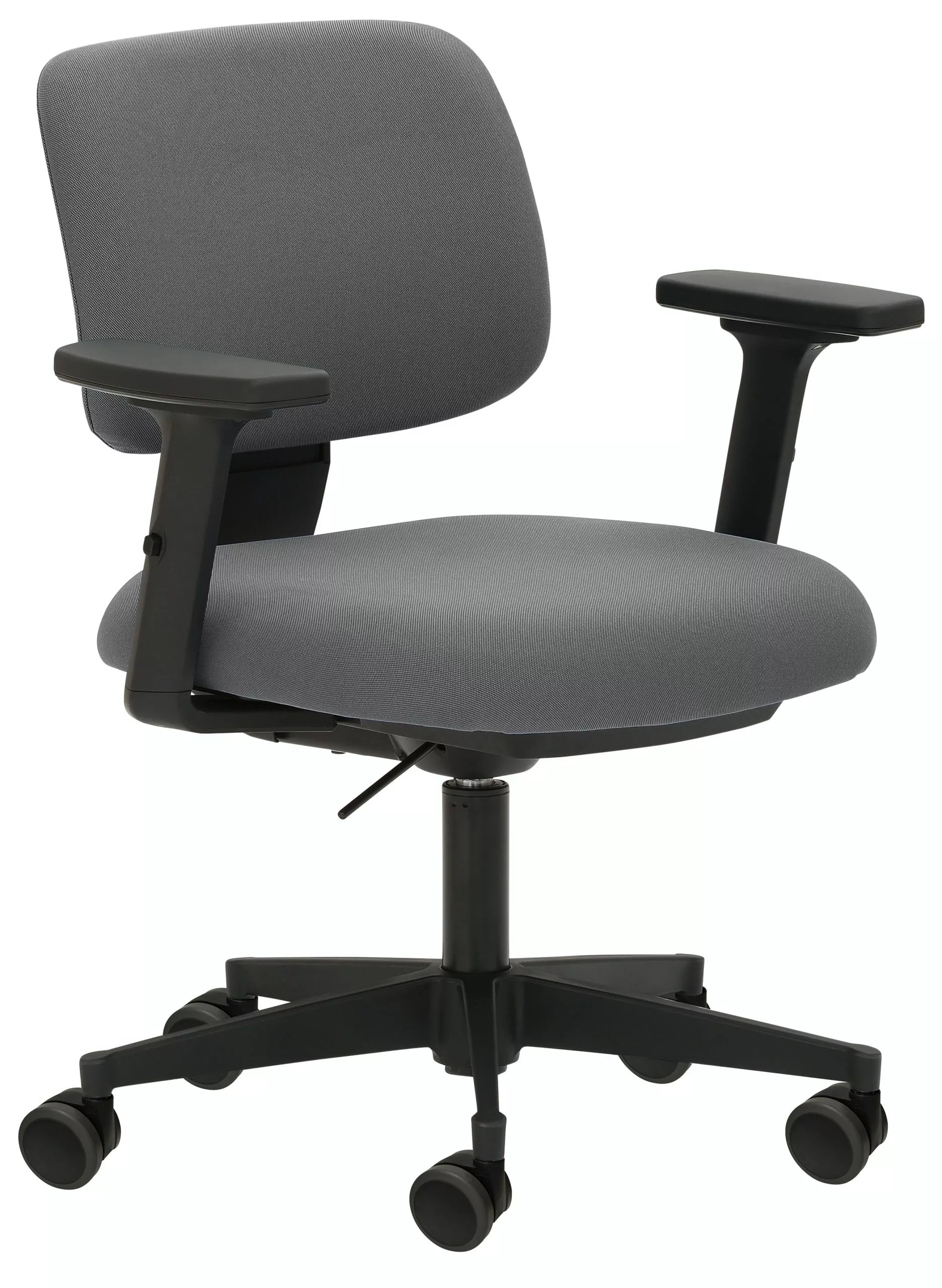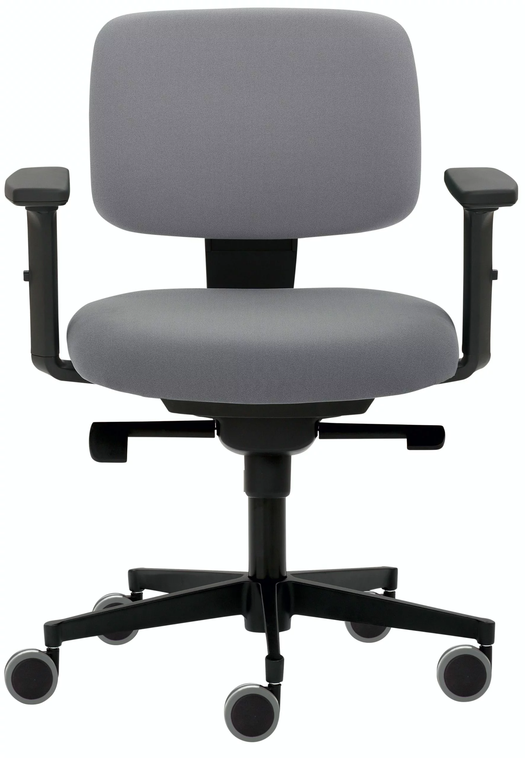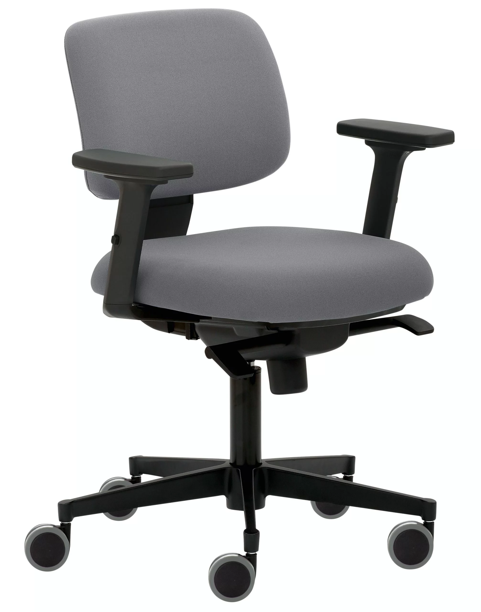 Kleiner Rücken, Sitz und Rücken gepolstert, Rücken-Raster-Höhenverstellung, Synchronmechanik mit individueller Gewichtseinstellung und Sitztiefenverstellung, stufenlose Höhenverstellung durch Gasfeder, Kunststoff-Fußkreuz schwarz, inkl. große und schwarze Hartbodenrollen, Sitzhöhe 50 – 61 cm. 2D-Armlehnen schwarz.