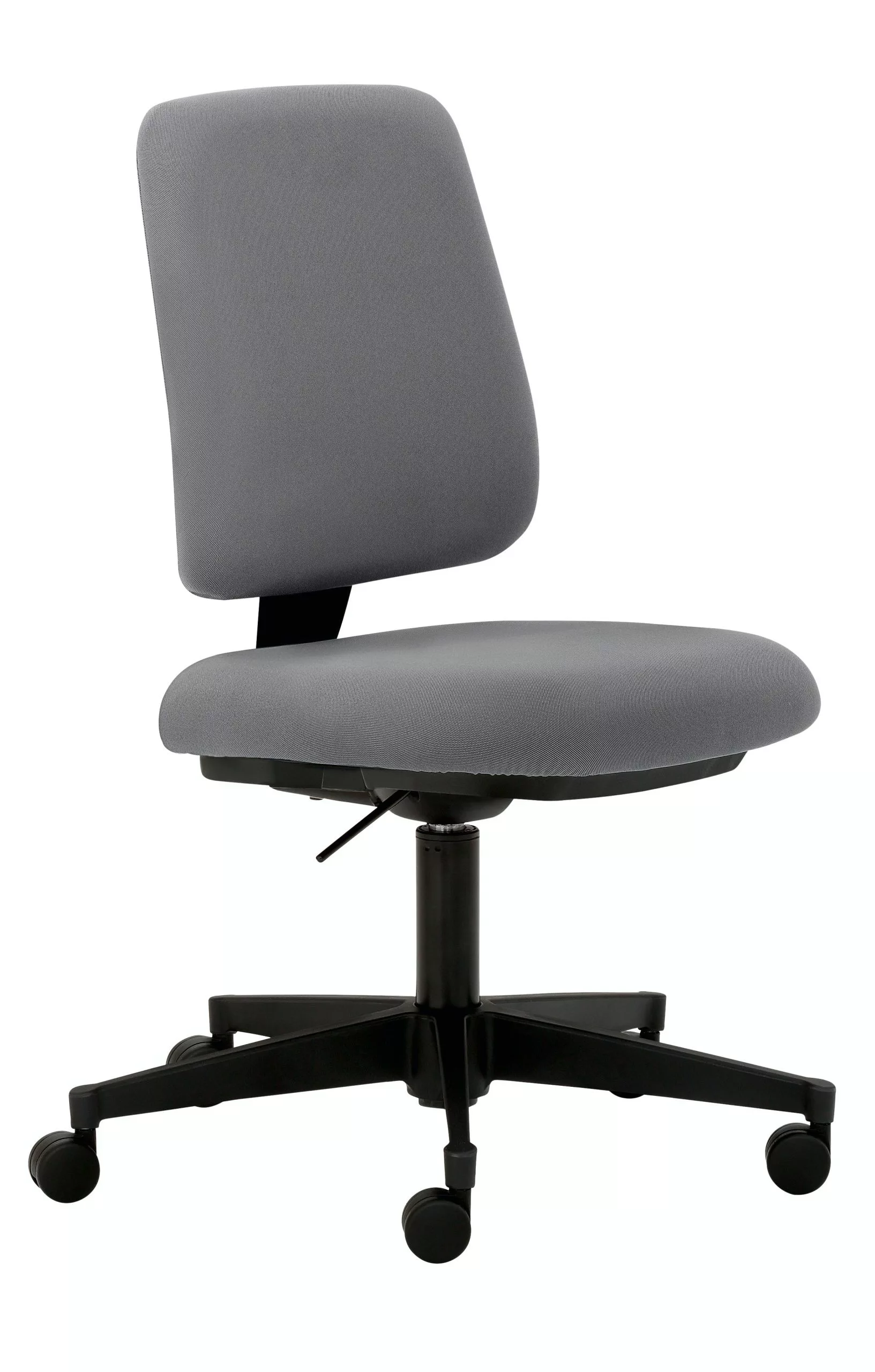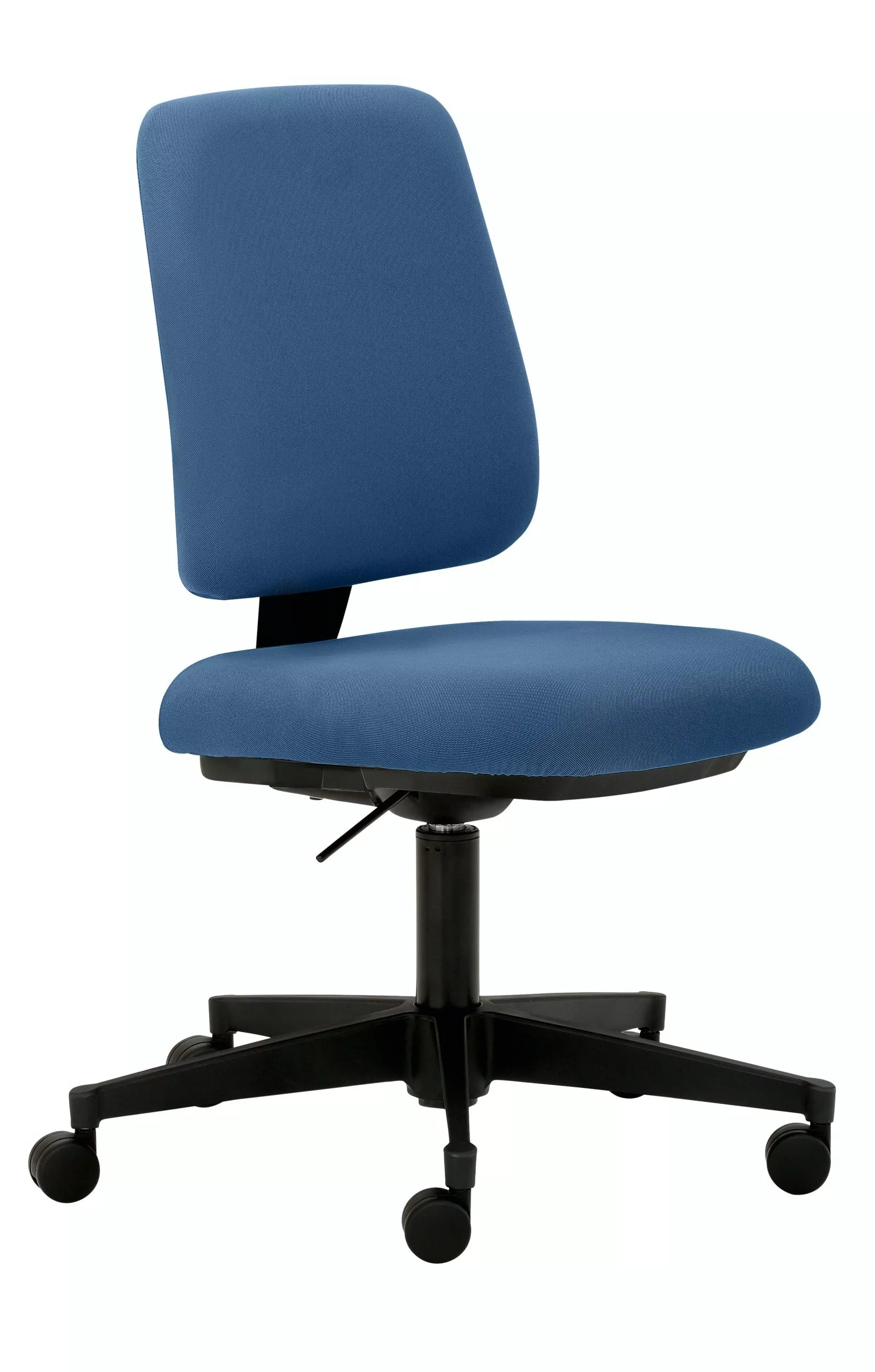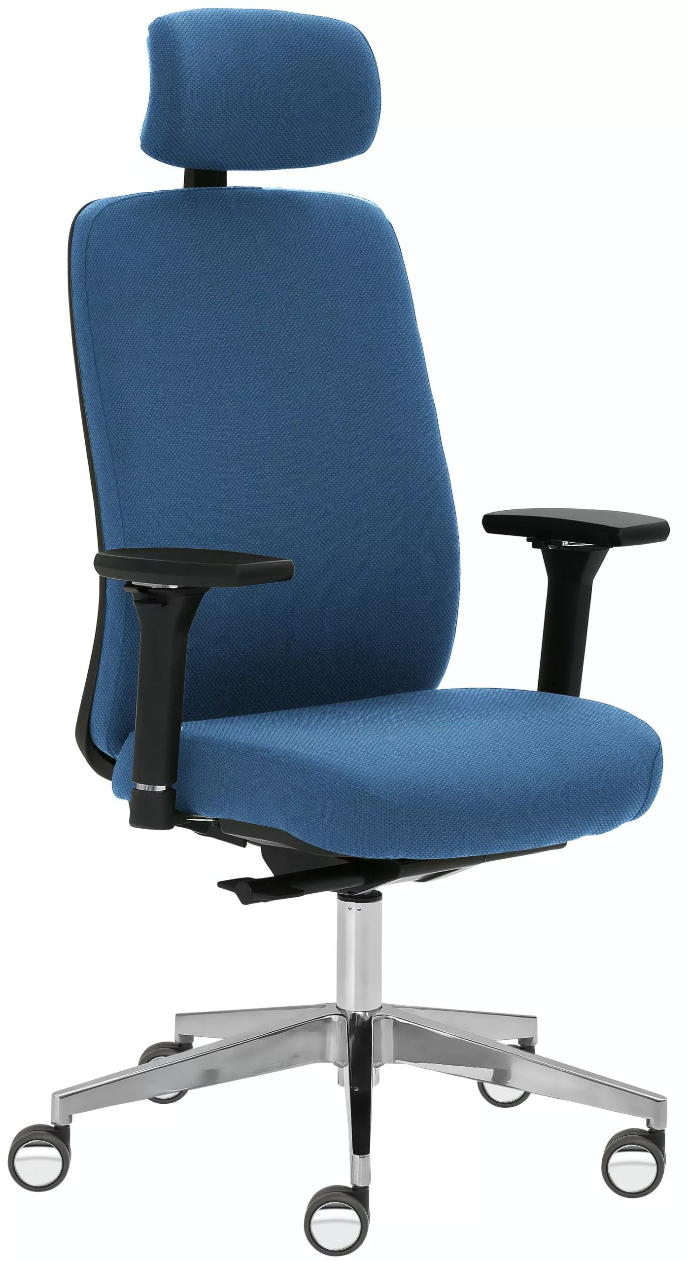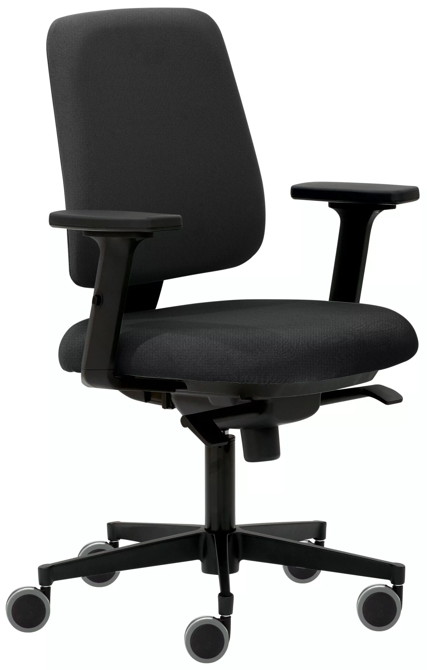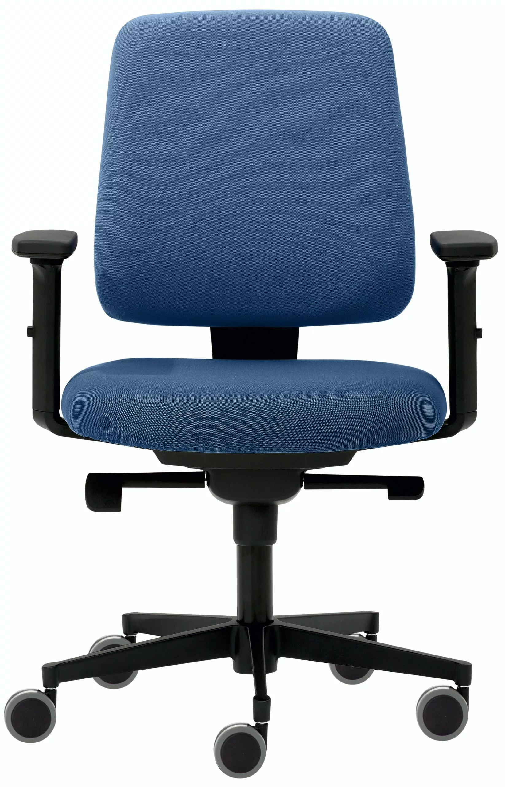 Großer Rücken, Sitz und Rücken gepolstert, Rücken-Raster-Höhenverstellung, Synchronmechanik mit individueller Gewichtseinstellung und Sitztiefenverstellung, stufenlose Höhenverstellung durch Gasfeder, Kunststoff-Fußkreuz schwarz, inkl. große und schwarze Hartbodenrollen, Sitzhöhe 50 – 61 cm. 2D-Armlehnen schwarz.