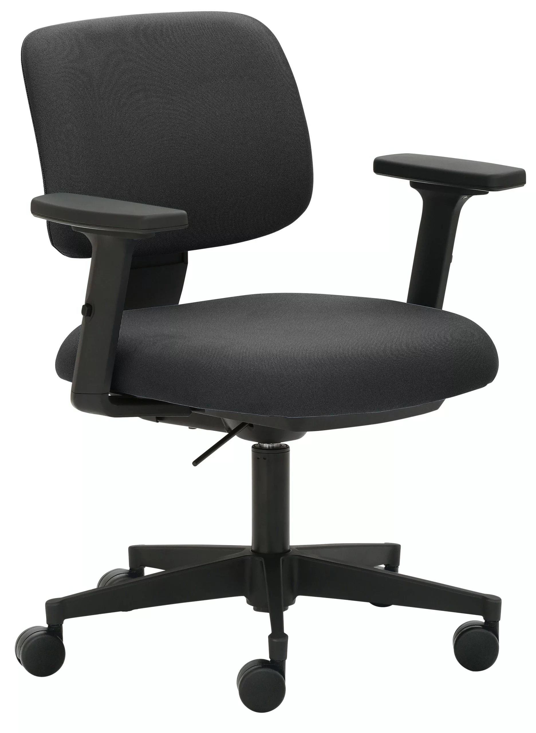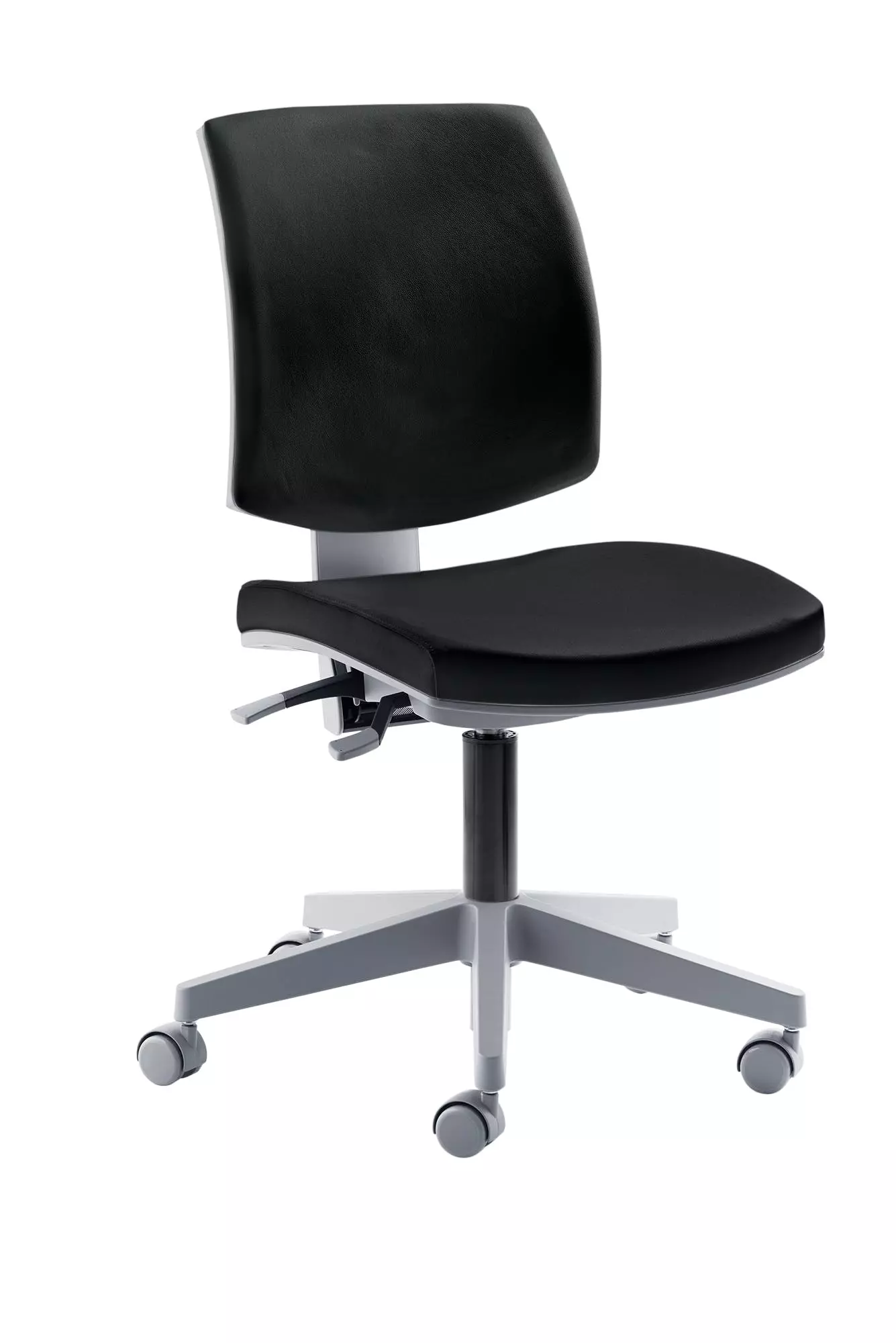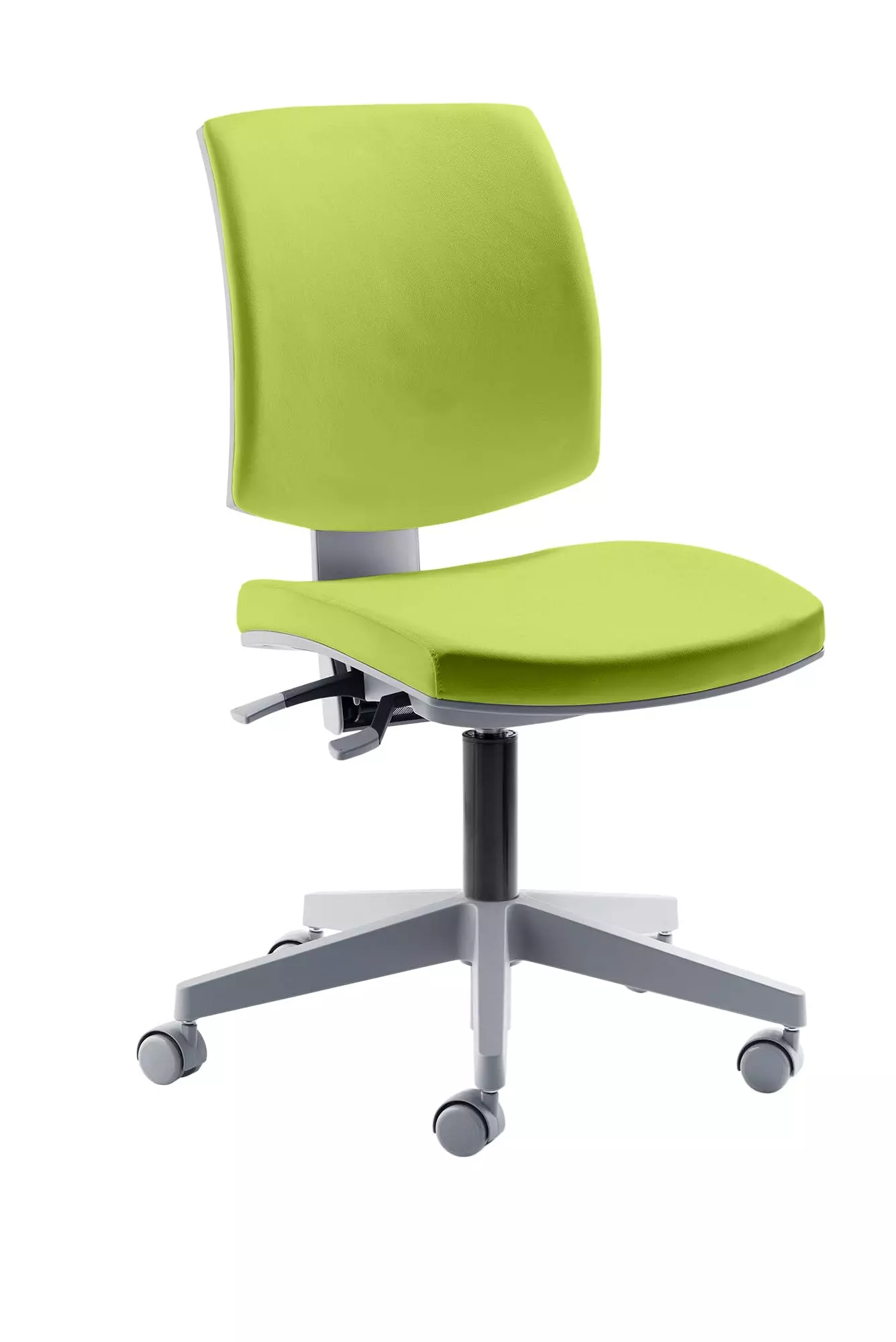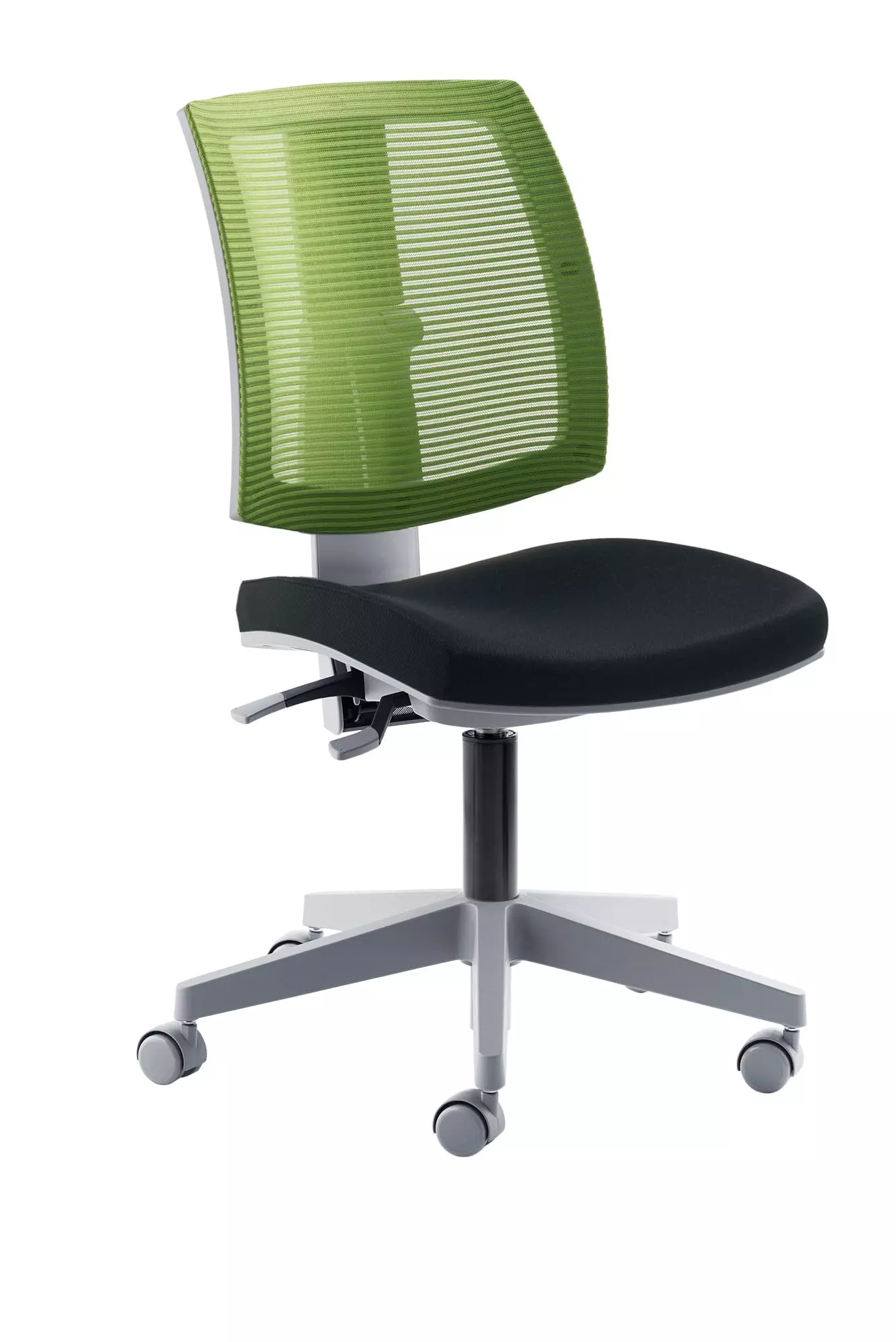 Gestell grau, Sitztiefe durch Rückenverstellung sehr leicht und stufenlos verstellbar, stufenlose Höhenverstellung durch Gasfeder, Fußkreuz Kunststoff grau, inkl. Universalrollen, Sitzhöhe 44 – 54 cm. Belastbar bis 150 kg. Besonders für Frauen geeignet. Sitz Stoff schwarz / Rücken Netz Grün.