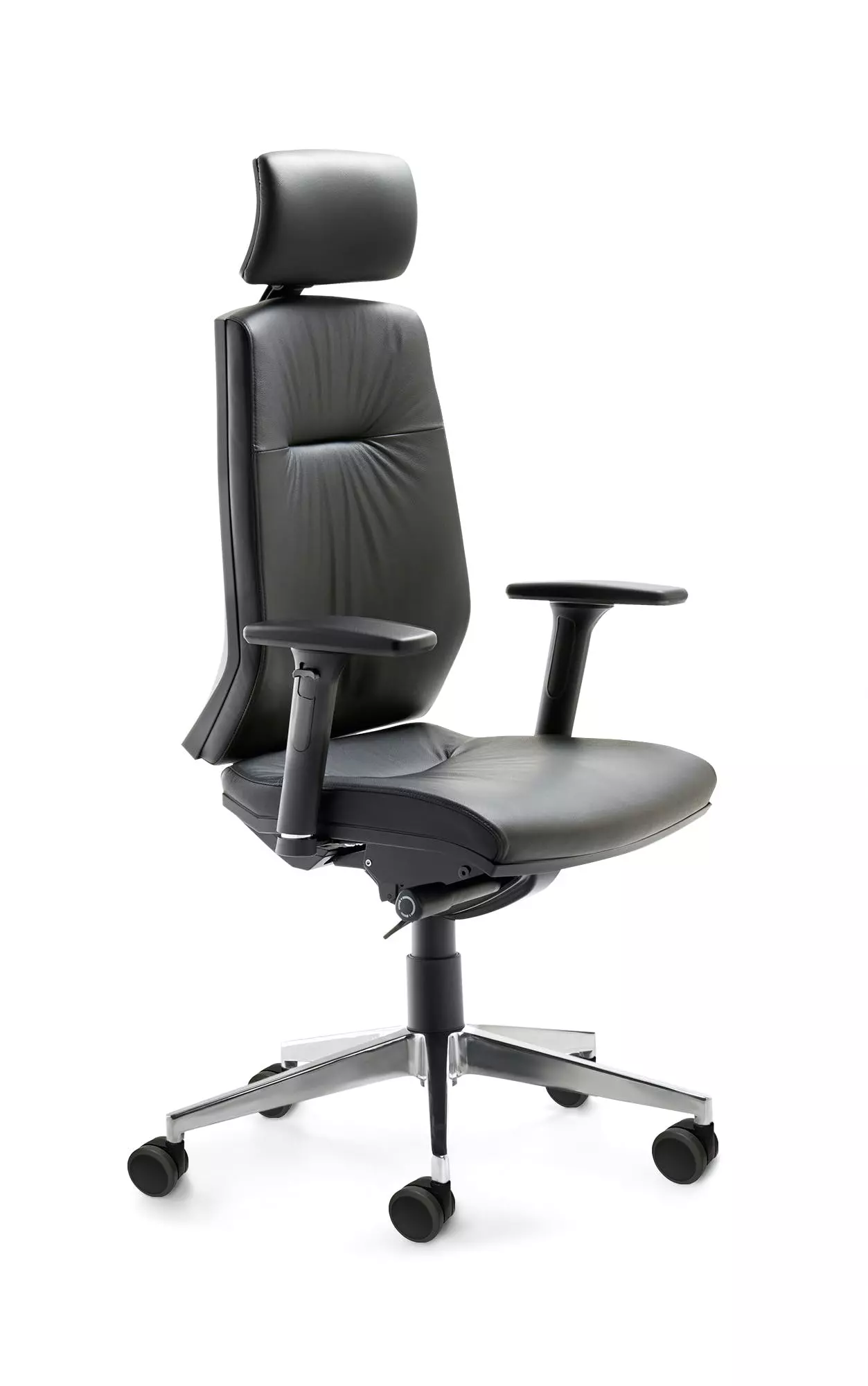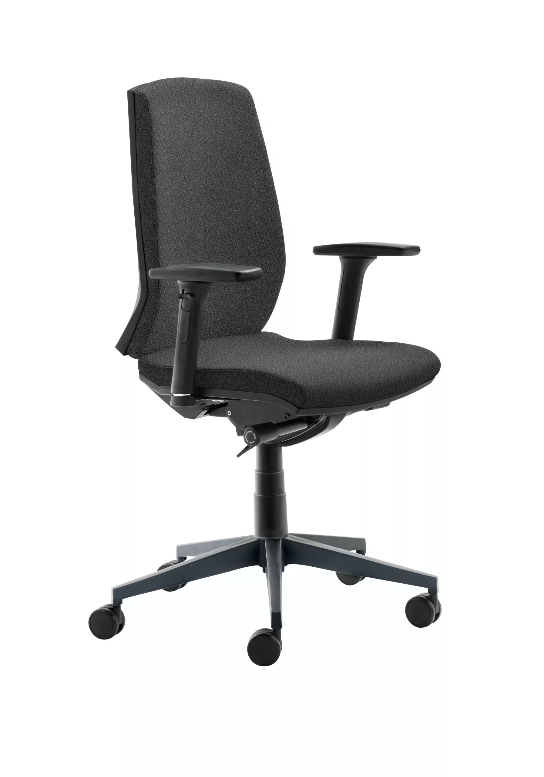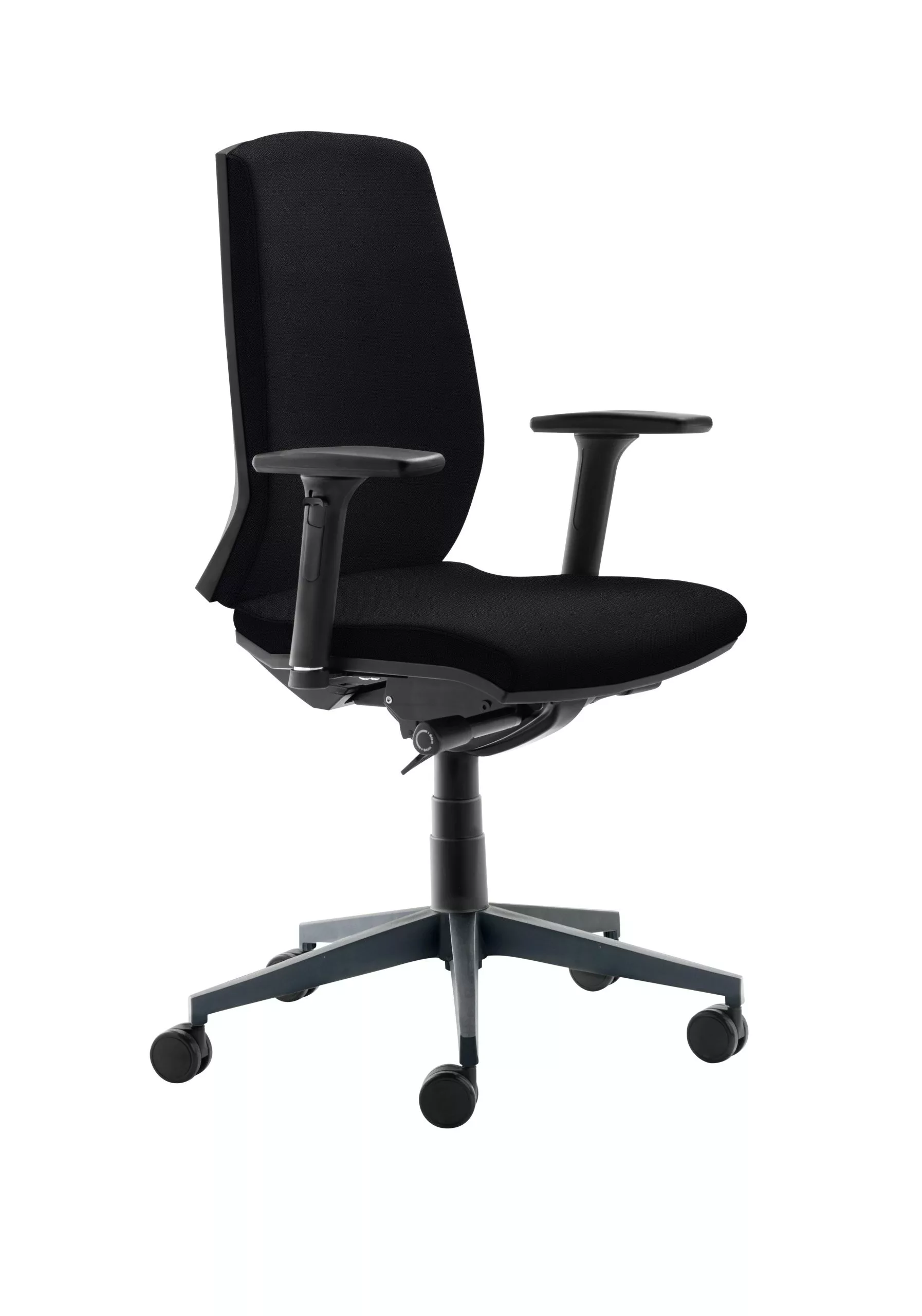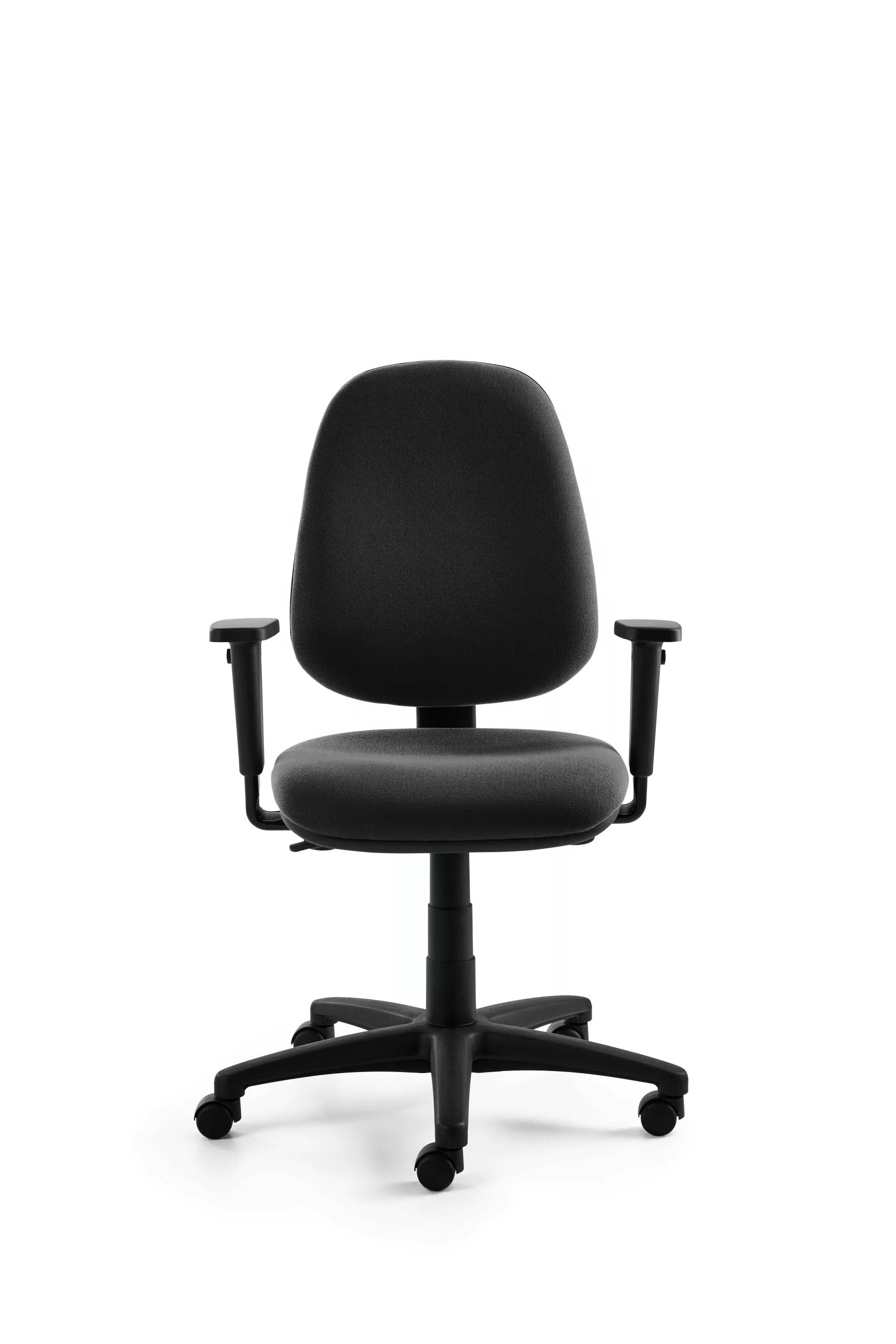 Hoher Rücken, Rückenhöhe 7-fach verstellbar, Synchronmechanik mit individueller Gewichtseinstellung und Sitztiefenverstellung, stufenlose Höhenverstellung durch Gasfeder, Kunststoff-Fußkreuz und Kunststoffteile schwarz, inkl. große Rollen für Teppichböden, Sitzhöhe 47 – 57 cm. Armlehnen höhenverstellbar, Pad verstellbar. Bandscheibensitz: hinterer Sitzbereich leicht erhöht, zwingt in eine aufrechtere Sitzposition.