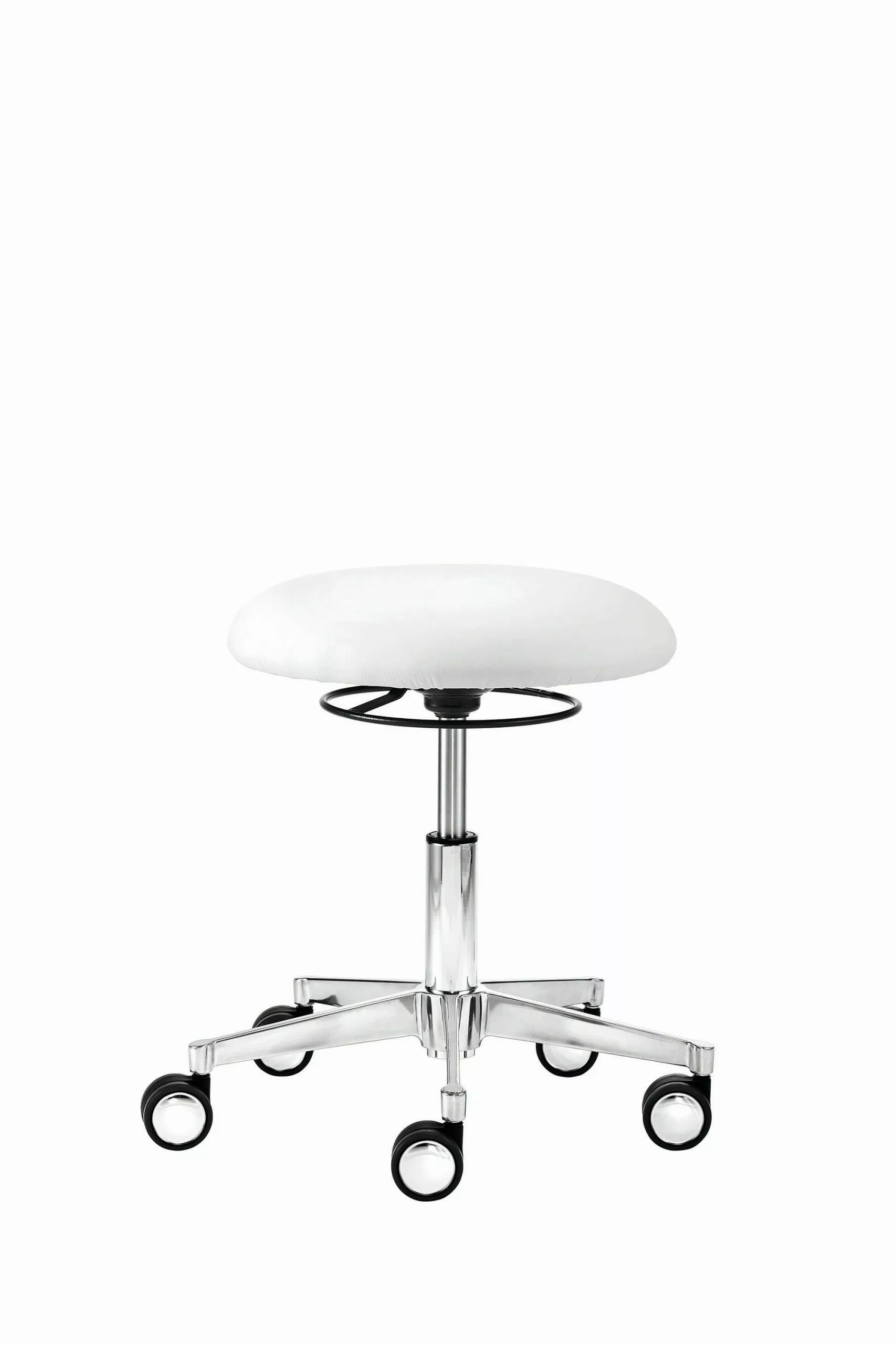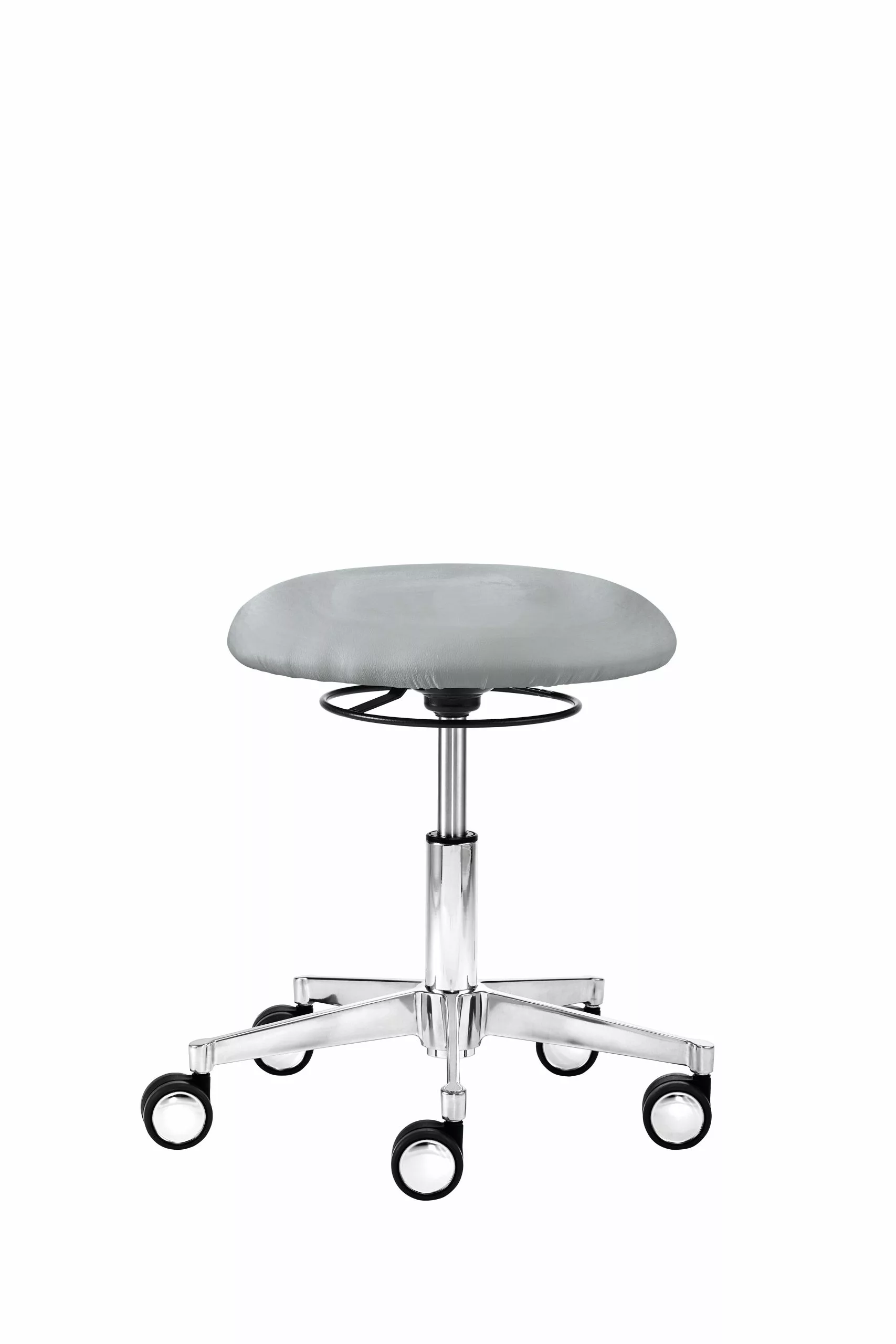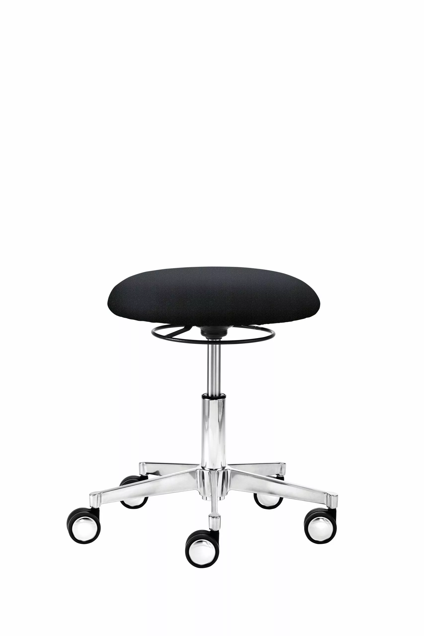Mit Tellersitz, stufenlose Höhenverstellung durch Gasfeder, Bewegungsfreiheit 360°, Ringauslöser, Alu-Fußkreuz (ø 52cm), inkl. Hartbodenrollen mit Chromblende, Sitzhöhe 41,5 – 52,5 cm.