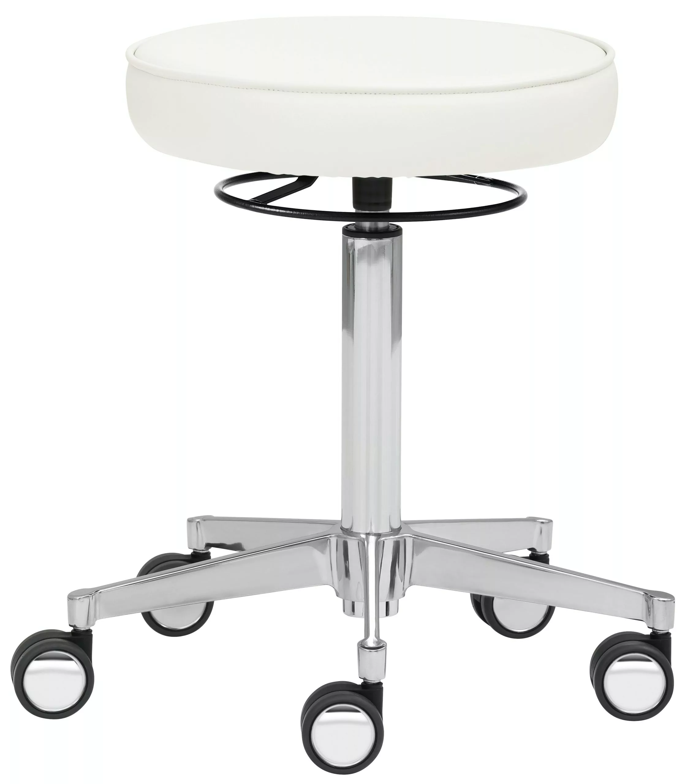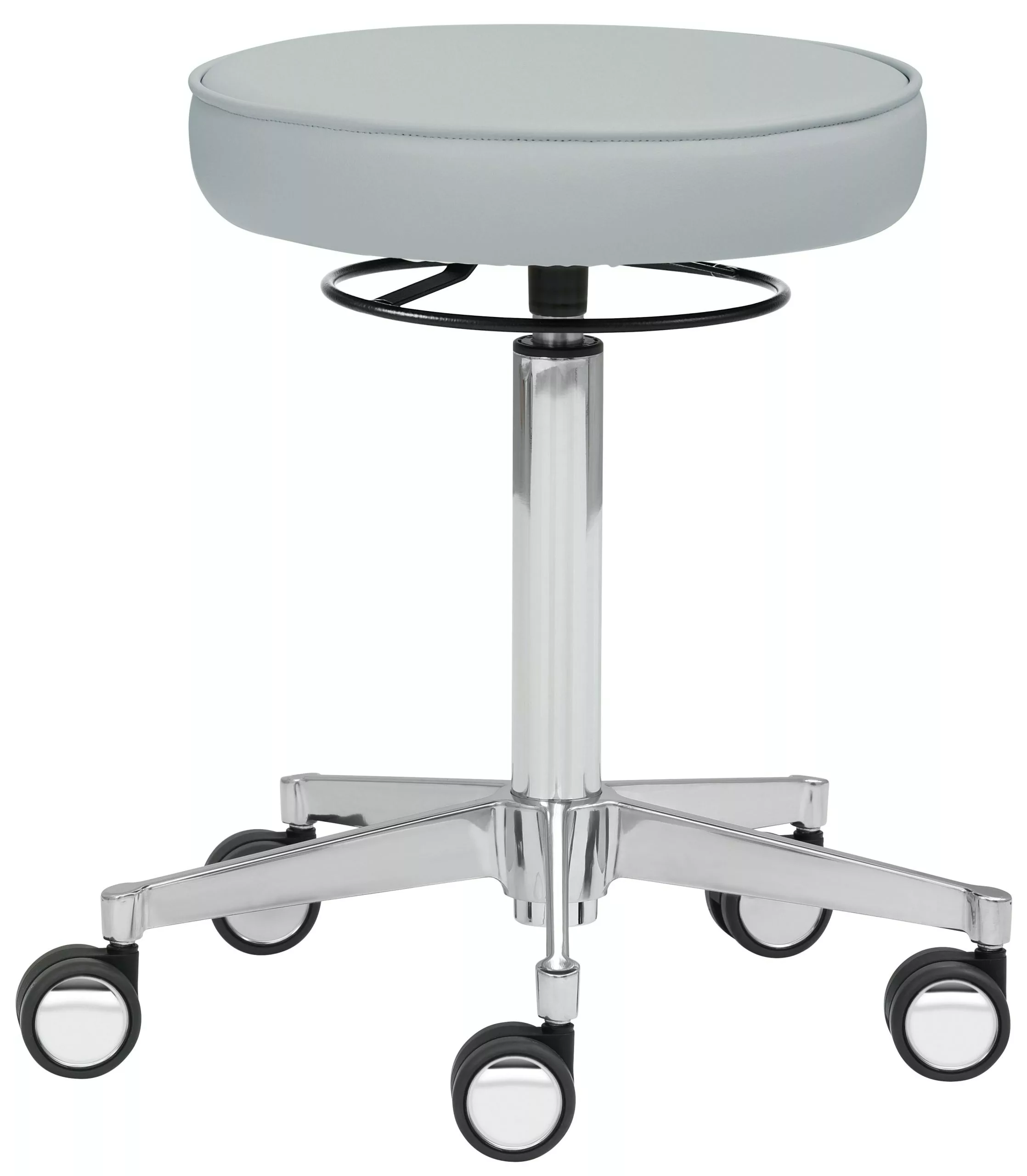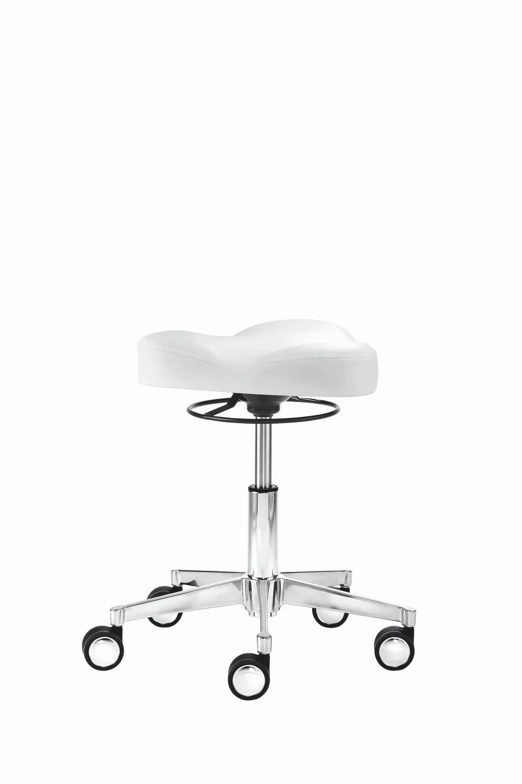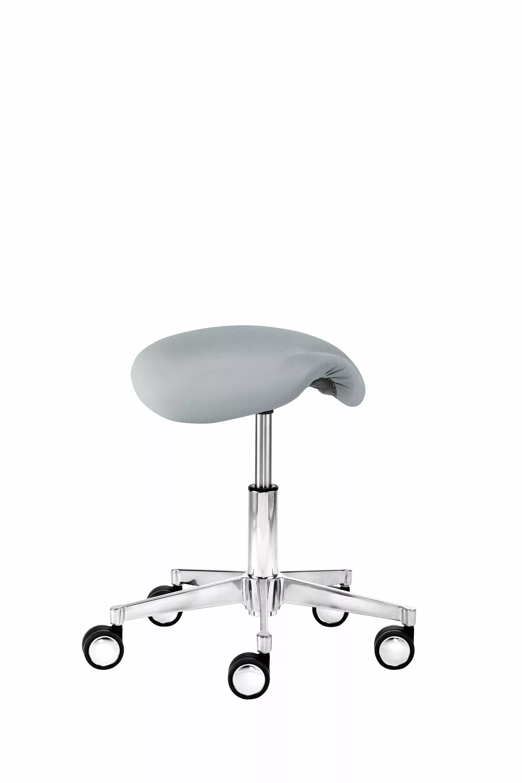 Mit gepolstertem Physioteller, hohe Chrom-Gasfeder, stufenlose Höhenverstellung, 360° Bewegungsfreiheit, Ringauslöser, Alu-Fußkreuz (ø 52 cm), inkl. Hartbodenrollen mit Chromblende, Sitzhöhe 53 – 72,5 cm.