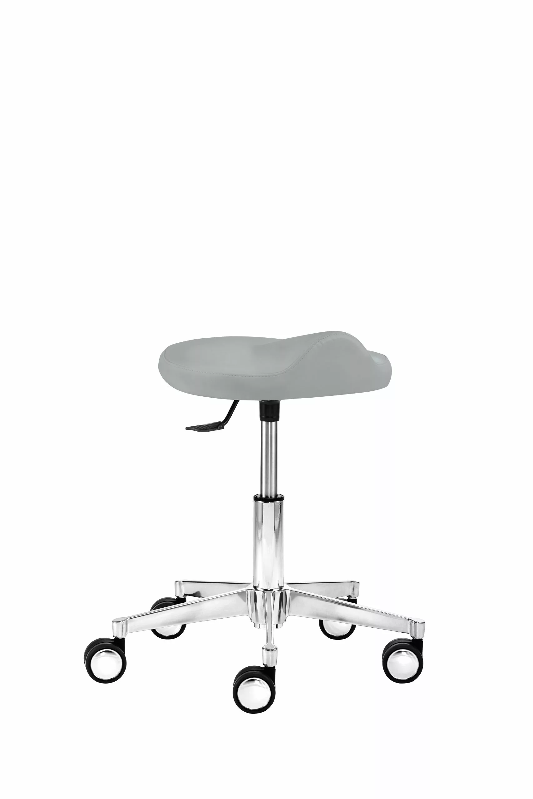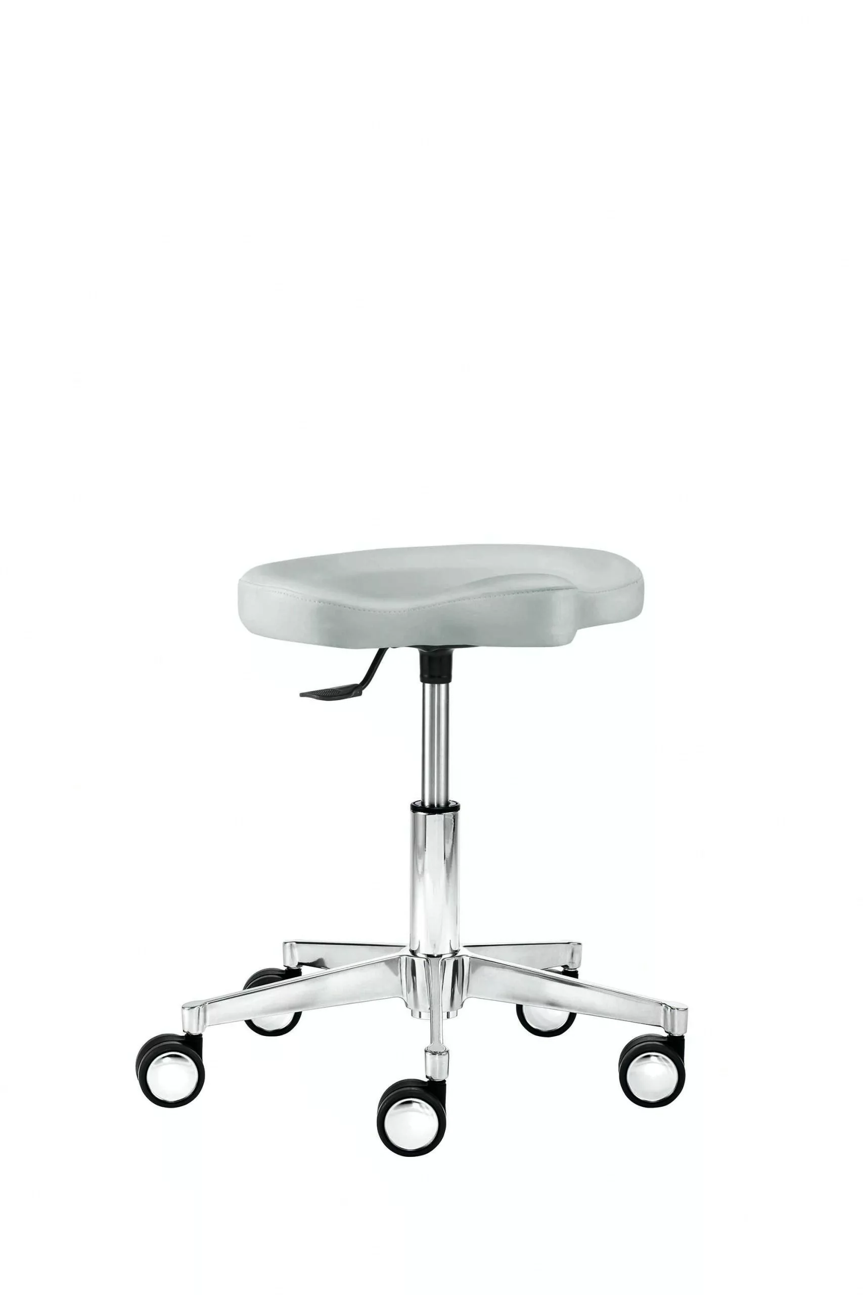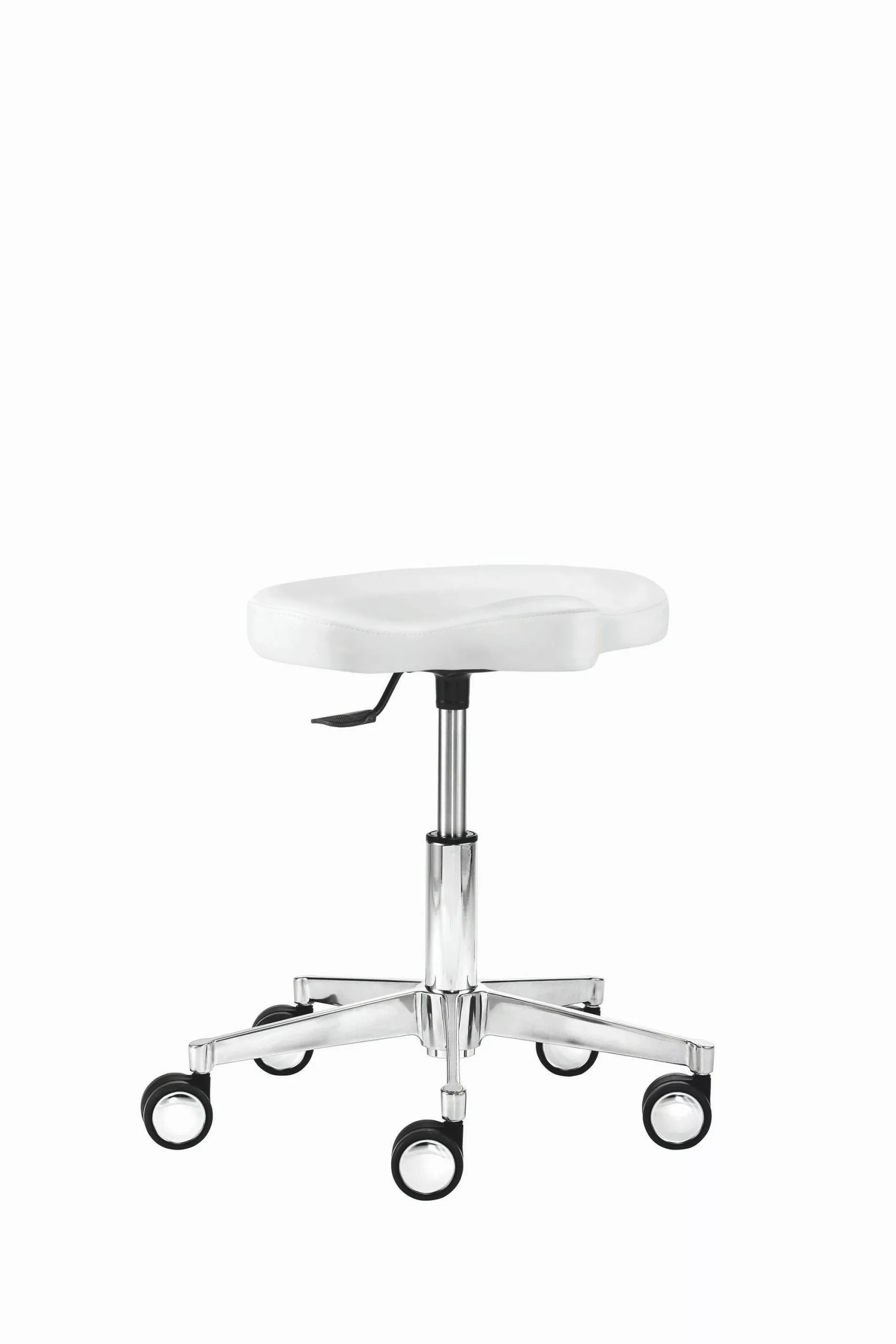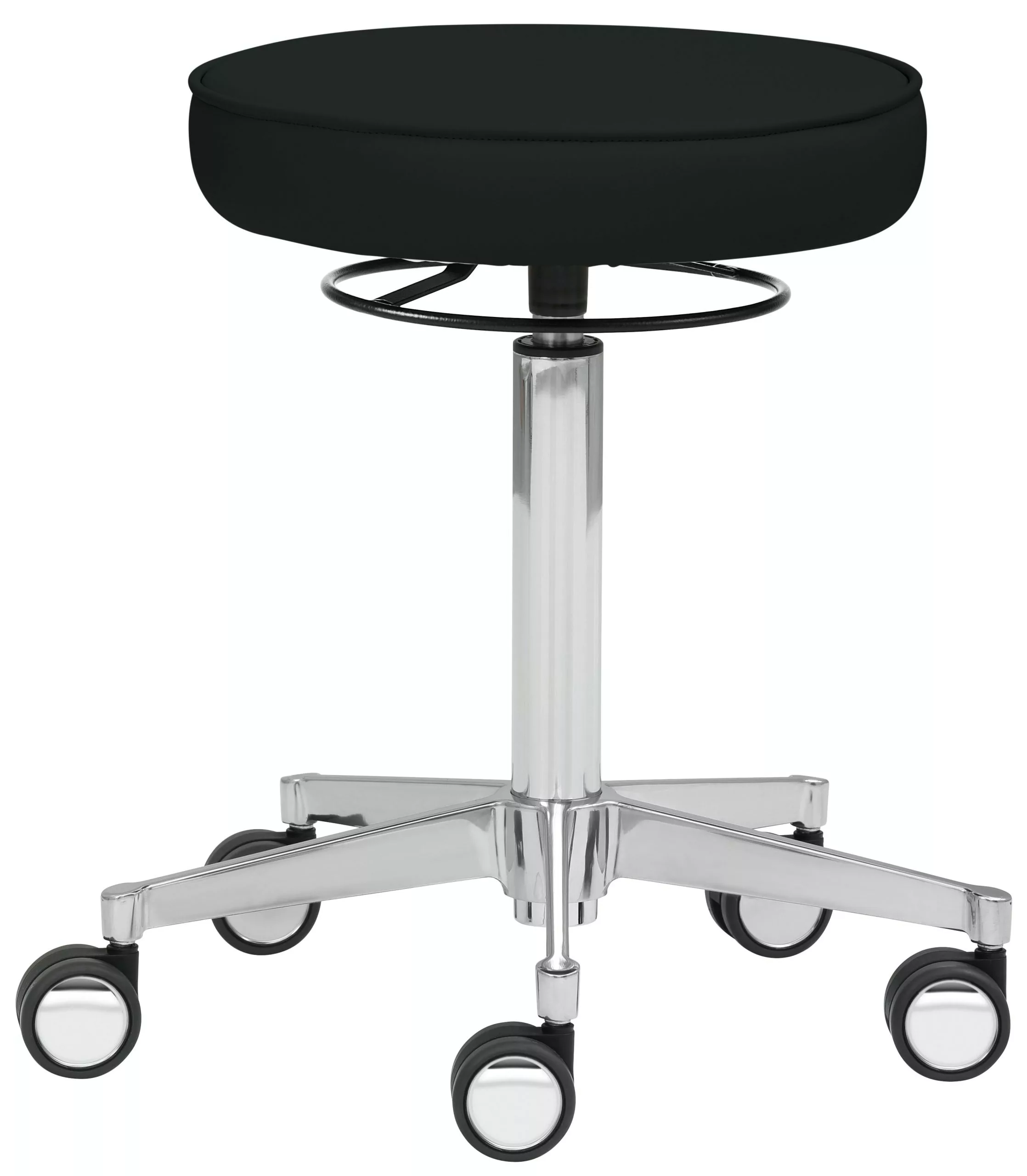 Mit Ergositz, stufenlose Höhenverstellung durch Gasfeder, Bewegungsfreiheit 360°, Hebelauslöser, Alu-Fußkreuz (ø 52 cm), inkl. Hartbodenrollen mit Chromblenden, Sitzhöhe 39 – 50 cm.