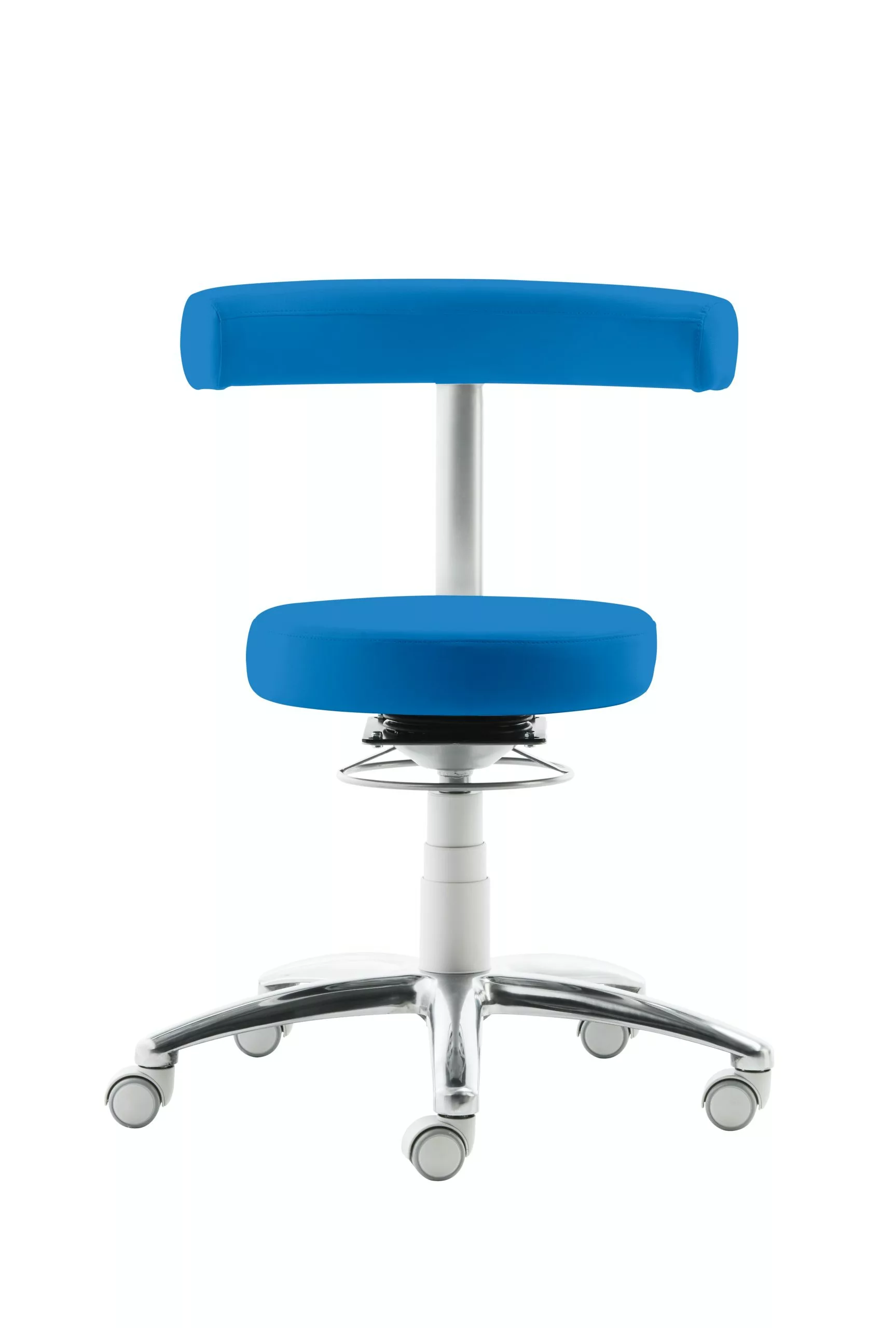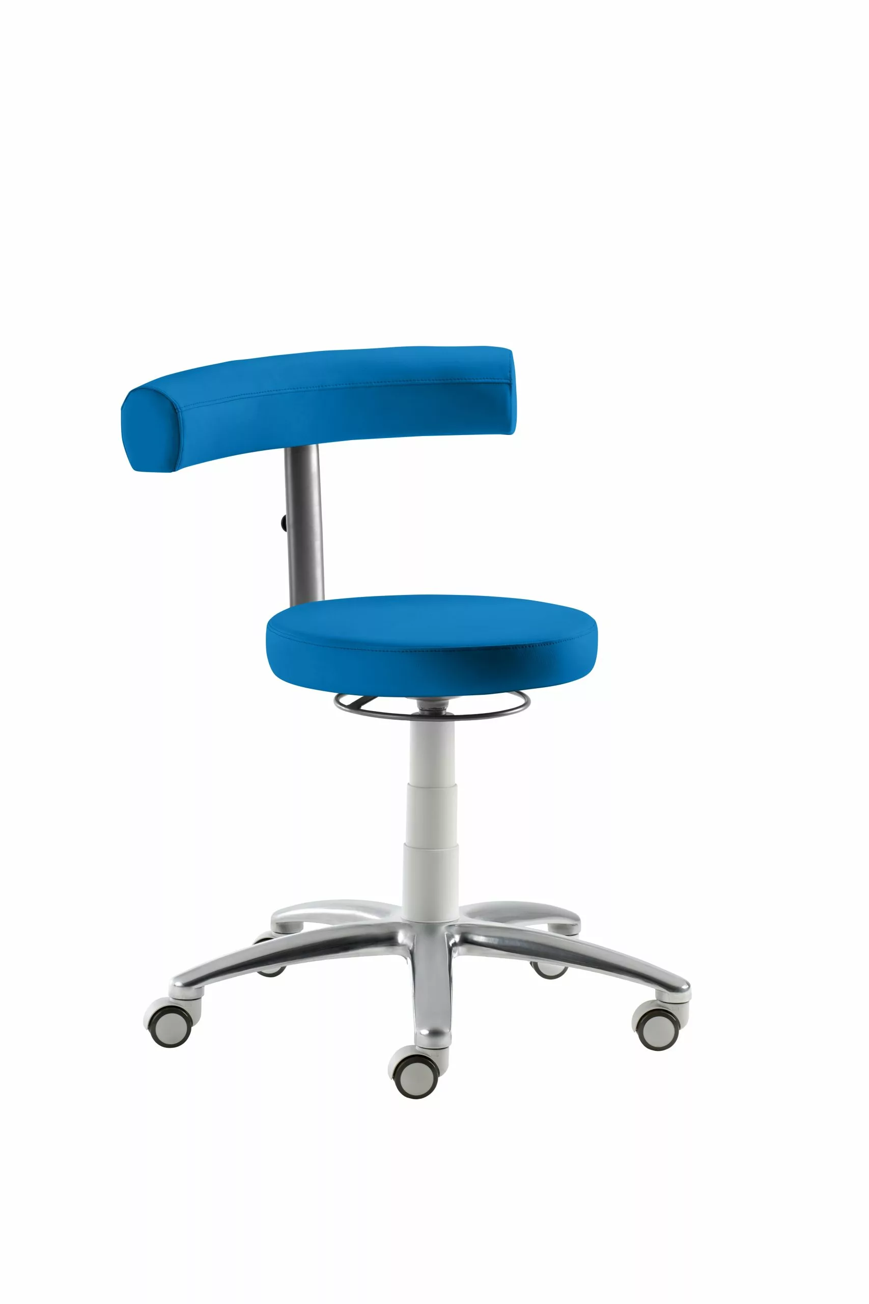 Sitz und Rücken gepolstert, Rücken-Rasterhöhenverstellung, stufenlose Höhenverstellung durch Gasfeder, Ringauslösung, Gestell lichtgrau und Alu-Fußkreuz poliert, inkl. Rollen für Hartböden, Sitzhöhe 44 – 56 cm.