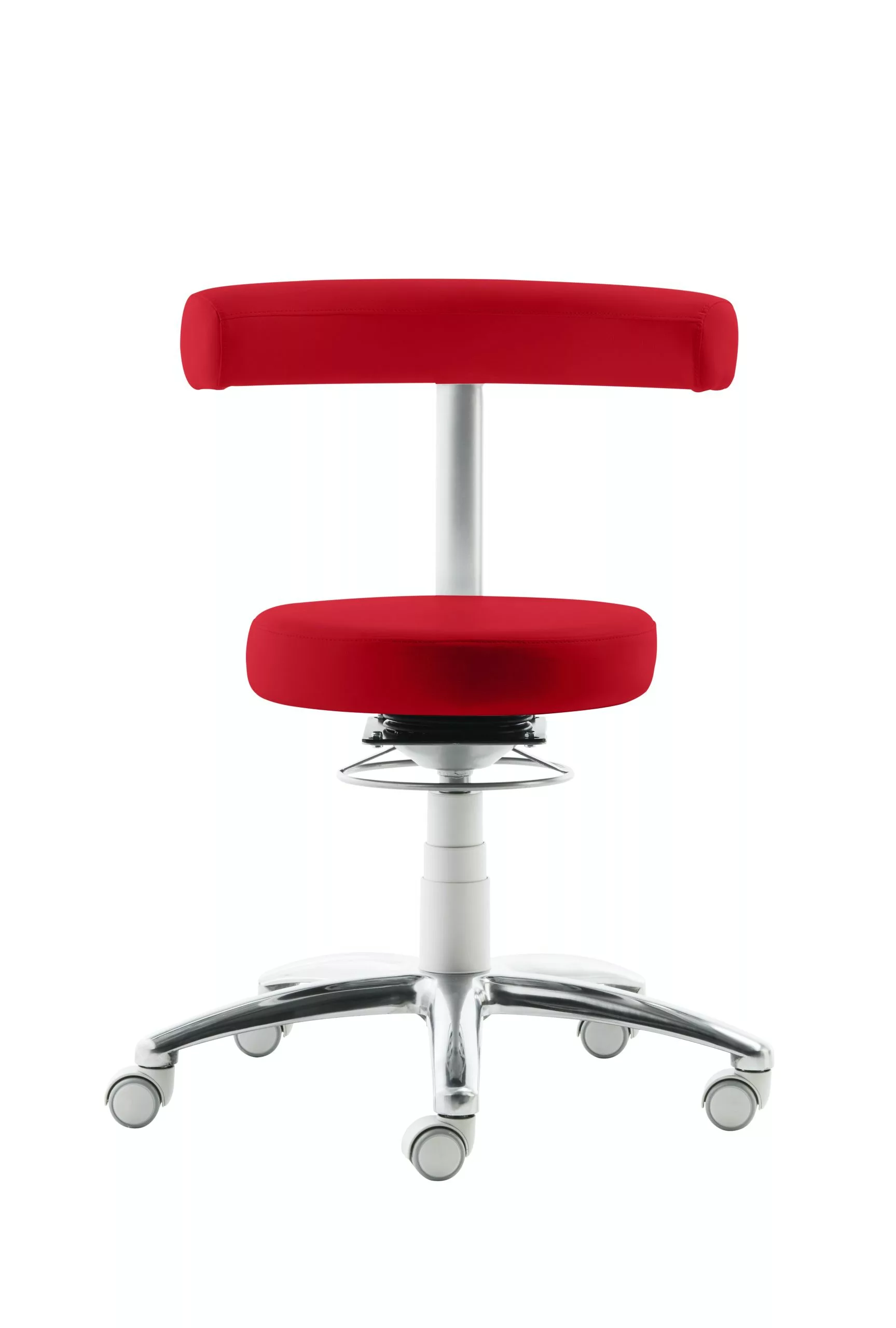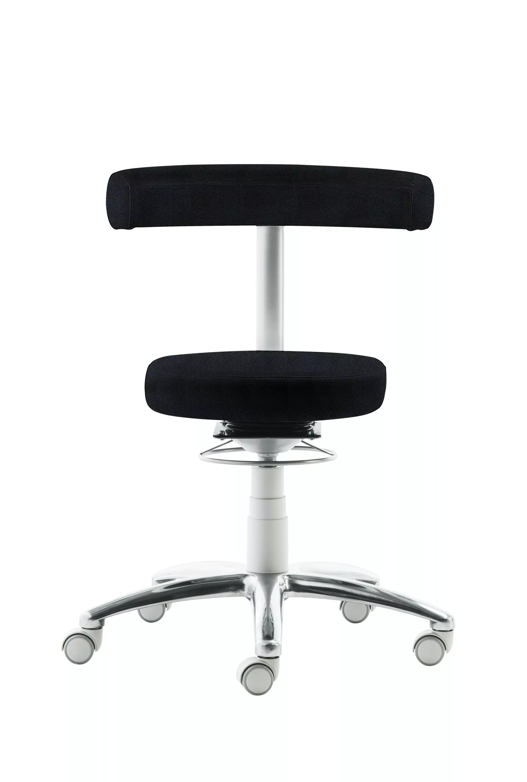 Sitz und Rücken gepolstert, Rücken-Rasterhöhenverstellung, stufenlose Höhenverstellung durch Gasfeder, Ringauslösung, Gestell lichtgrau und Alu-Fußkreuz poliert, inkl. Rollen für Hartböden, Sitzhöhe 44 – 56 cm.