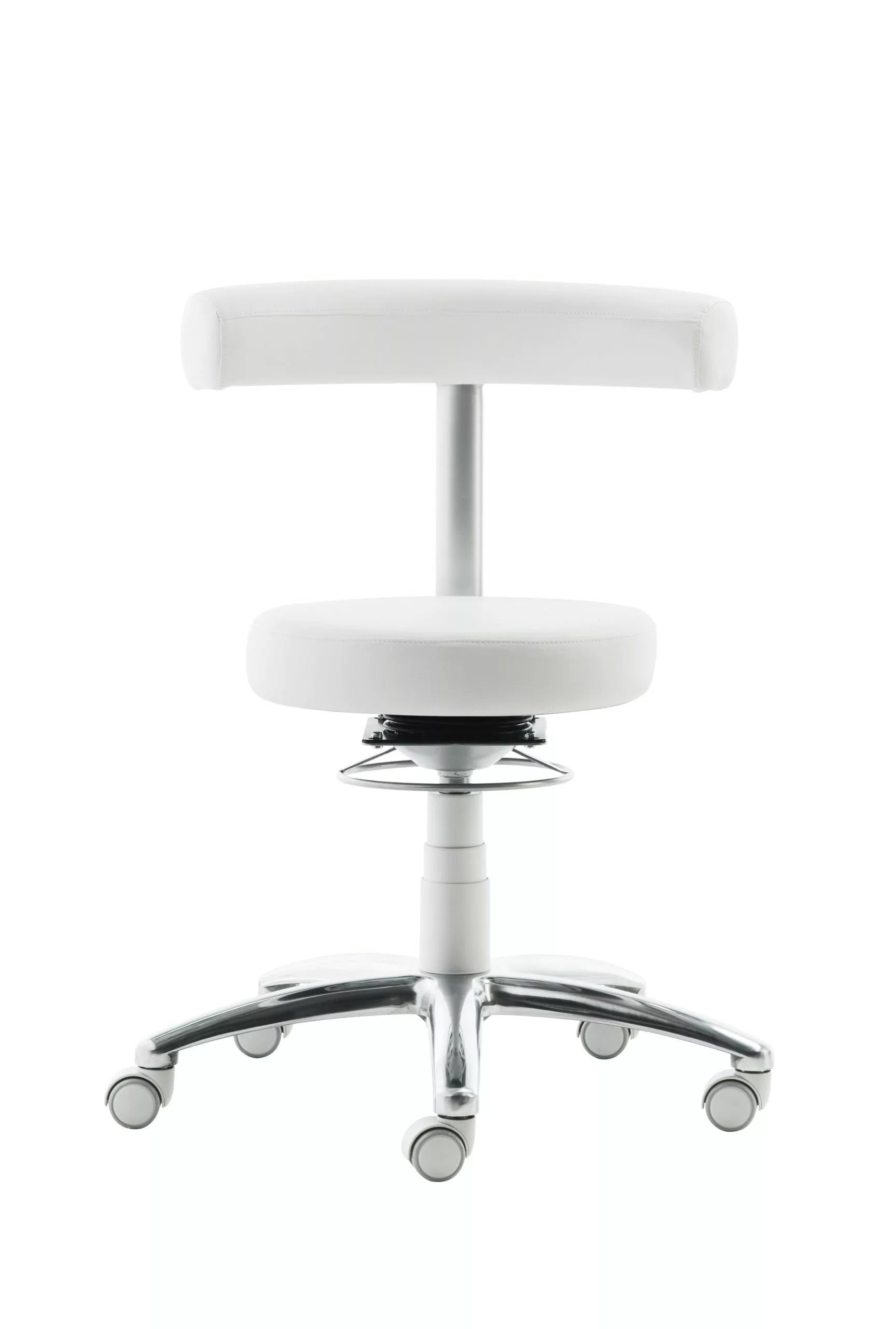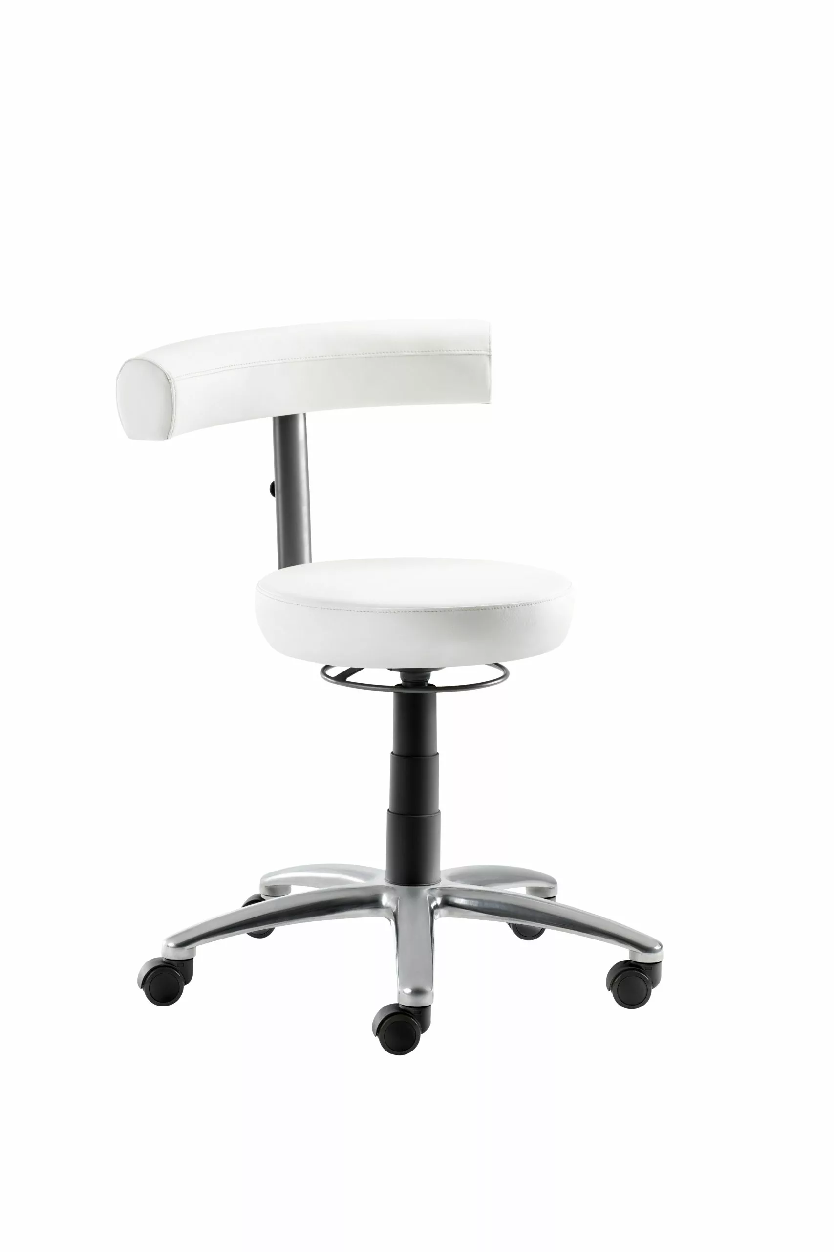 Sitz und Rücken gepolstert, Rücken-Rasterhöhenverstellung, stufenlose Höhenverstellung durch Gasfeder, Ringauslösung, Gestell schwarz und Alu-Fußkreuz poliert, inkl. Rollen für Hartböden, Sitzhöhe 44 – 56 cm.