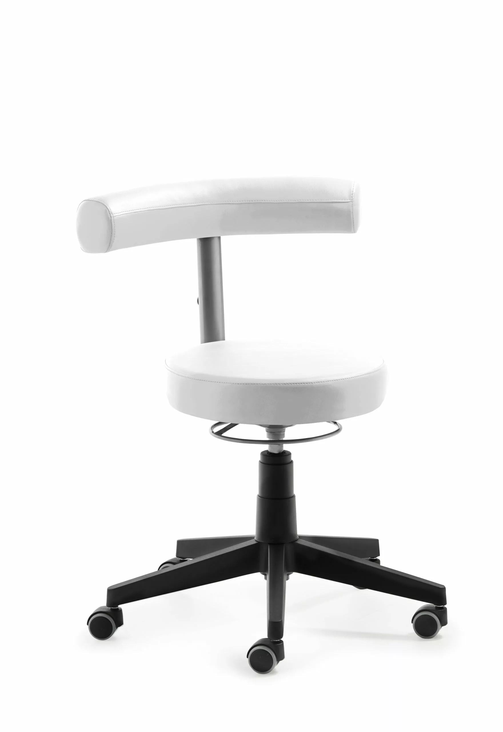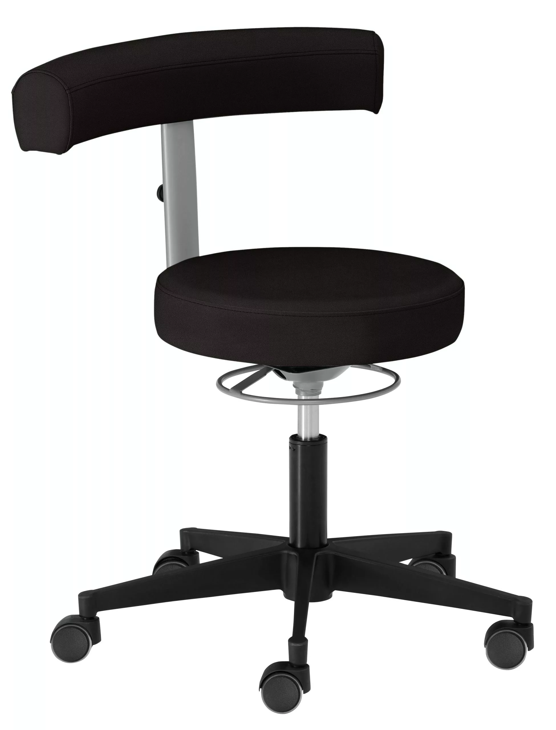 Sitz und Rücken gepolstert, unifarben oder kombiniert lieferbar, Rückenlehne/Armauflage 4-fach höhenverstellbar und um 360° drehbar, stufenlose Höhenverstellung durch Gasfeder, Ringauslösung, Kunststoff-Fußkreuz schwarz (Ø 61 cm), inkl. Rollen für Hartboden, Sitzhöhe 40 – 50 cm (besonders niedrig).