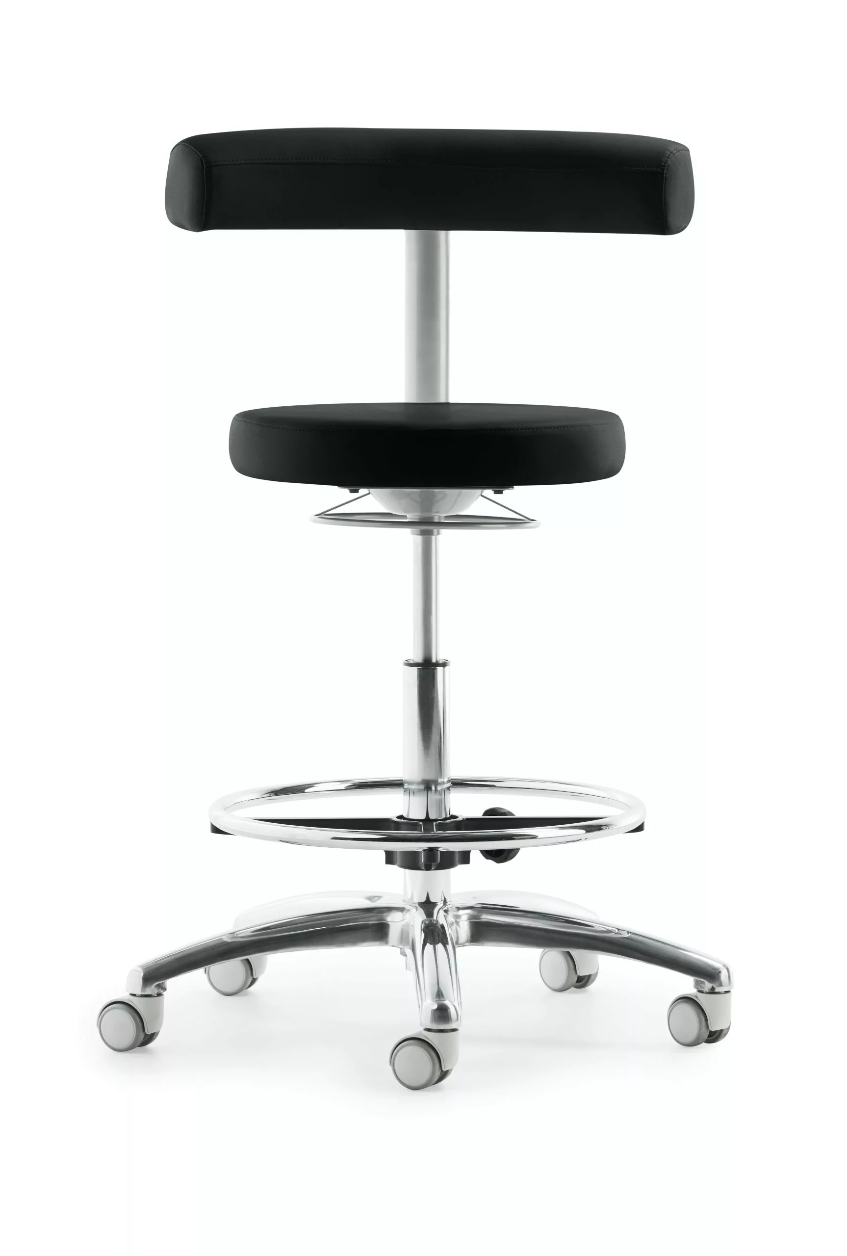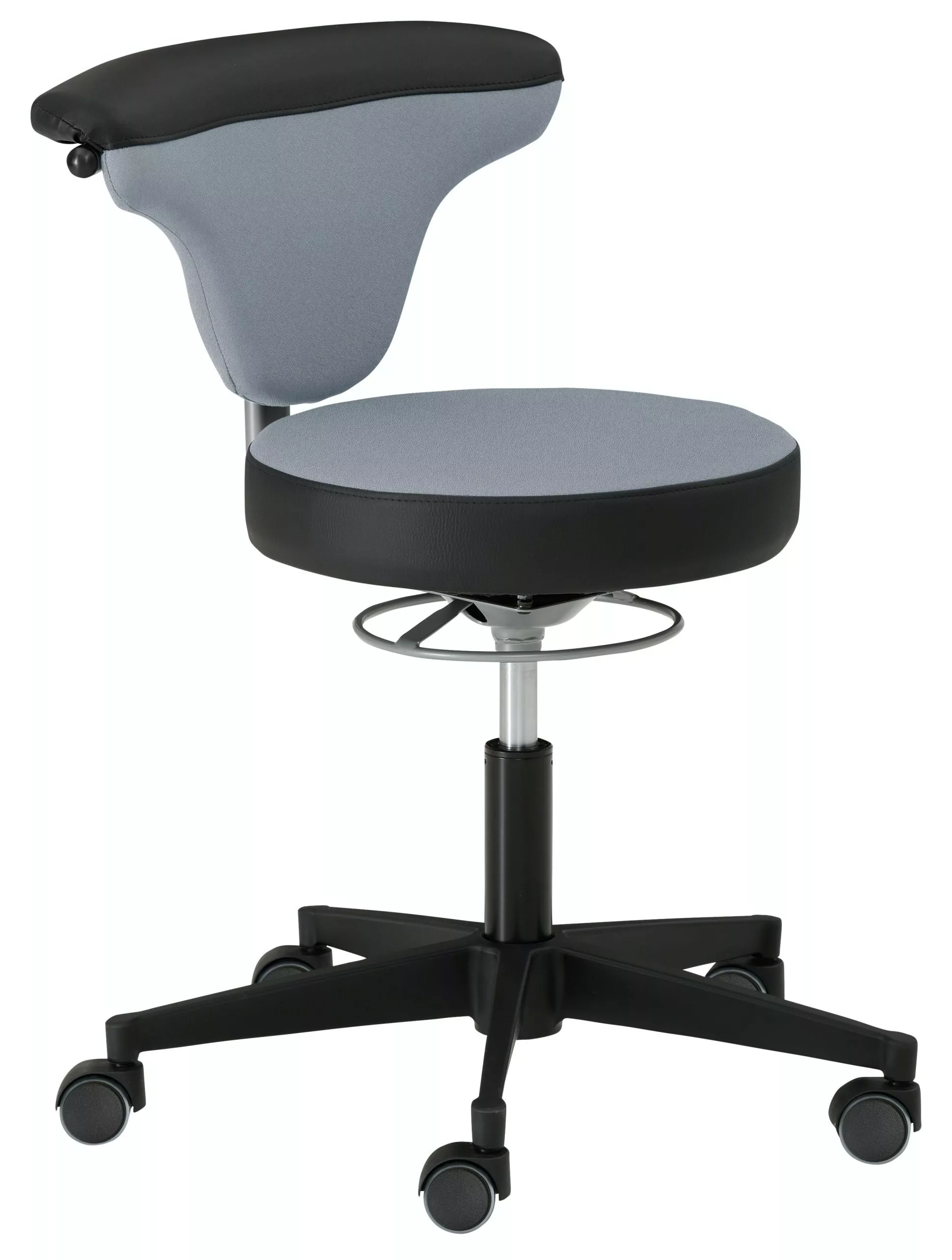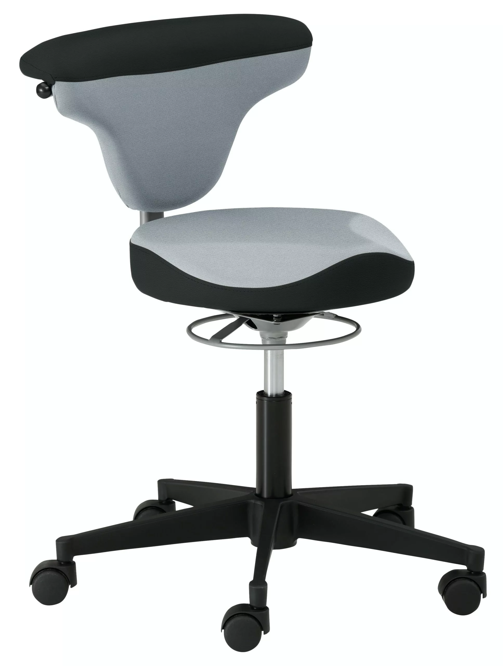 Sitz und Rücken gepolstert, unifarben oder kombiniert lieferbar, Rückenlehne/Armauflage 360° drehbar, stufenlose Höhenverstellung durch Gasfeder, Ringauslösung, Kunststoff-Fußkreuz schwarz (Ø 61 cm), Gestell und Ringauslöser perlsilber, inkl. Rollen für Teppichböden, Sitzhöhe 39 – 50 cm (besonders niedrig), belastbar bis 140 kg.