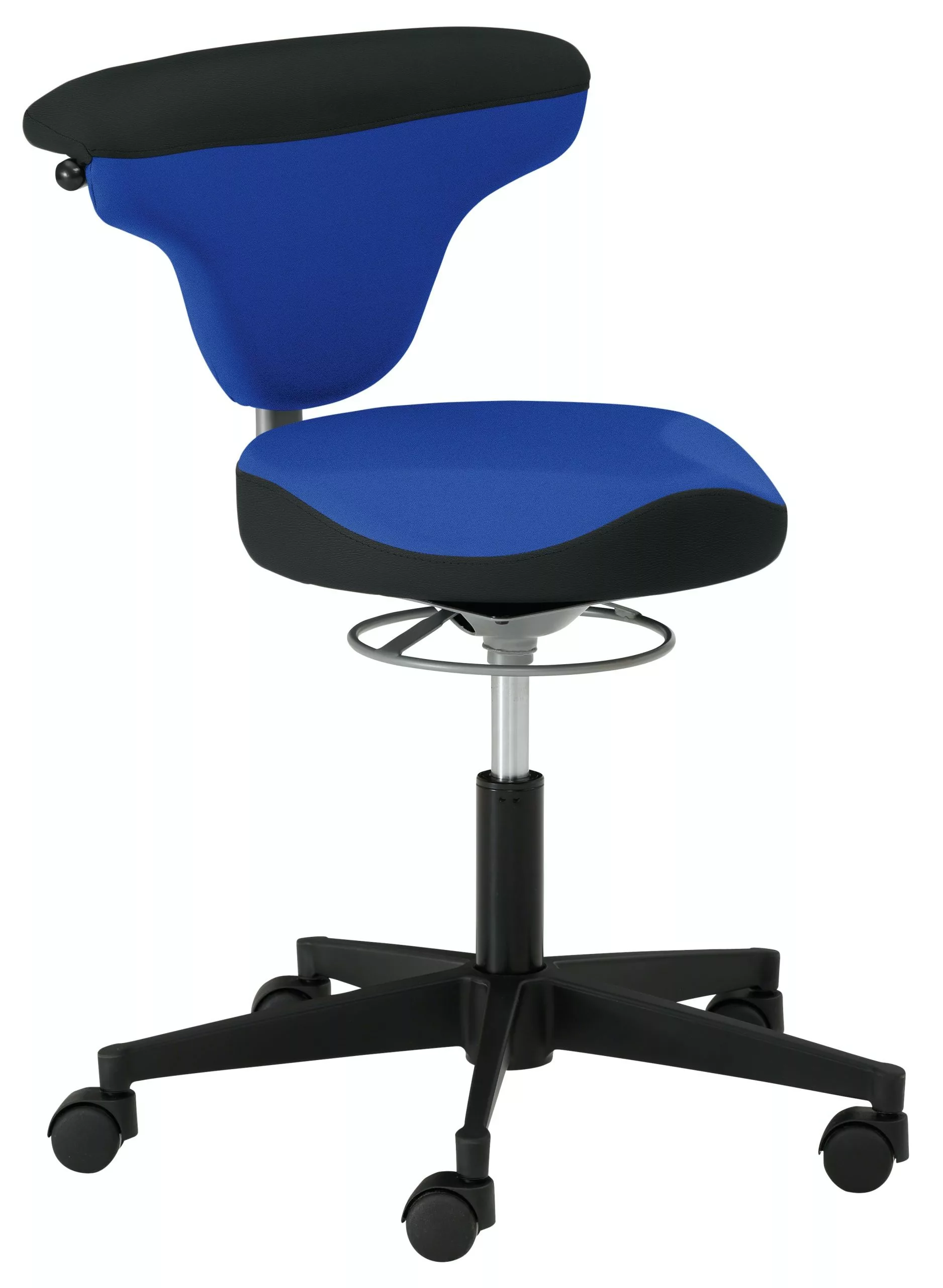 Sitz und Rücken gepolstert, unifarben oder kombiniert lieferbar, ergonomisch geformter Hockersitz aus hochwertigem Polyurethan mit Schichtholzeinlage, Rückenlehne/Armauflage 360° drehbar, stufenlose Höhenverstellung mittels Ringauslöser, Gasfeder schwarz, Kunststoff-Fußkreuz schwarz (Ø 61 cm), Gestell und Ringauslöser perlsilber, inkl. Rollen für Teppichböden, Sitzhöhe 39 – 50 cm (besonders niedrig), belastbar bis 140 kg.