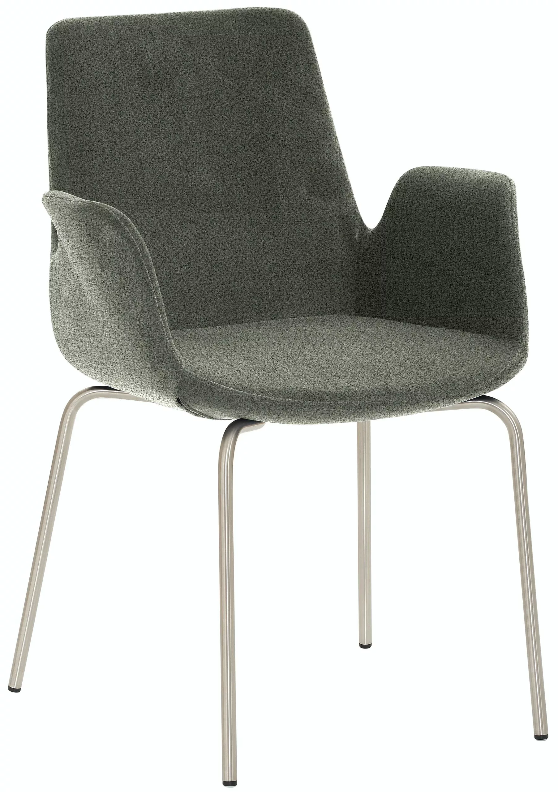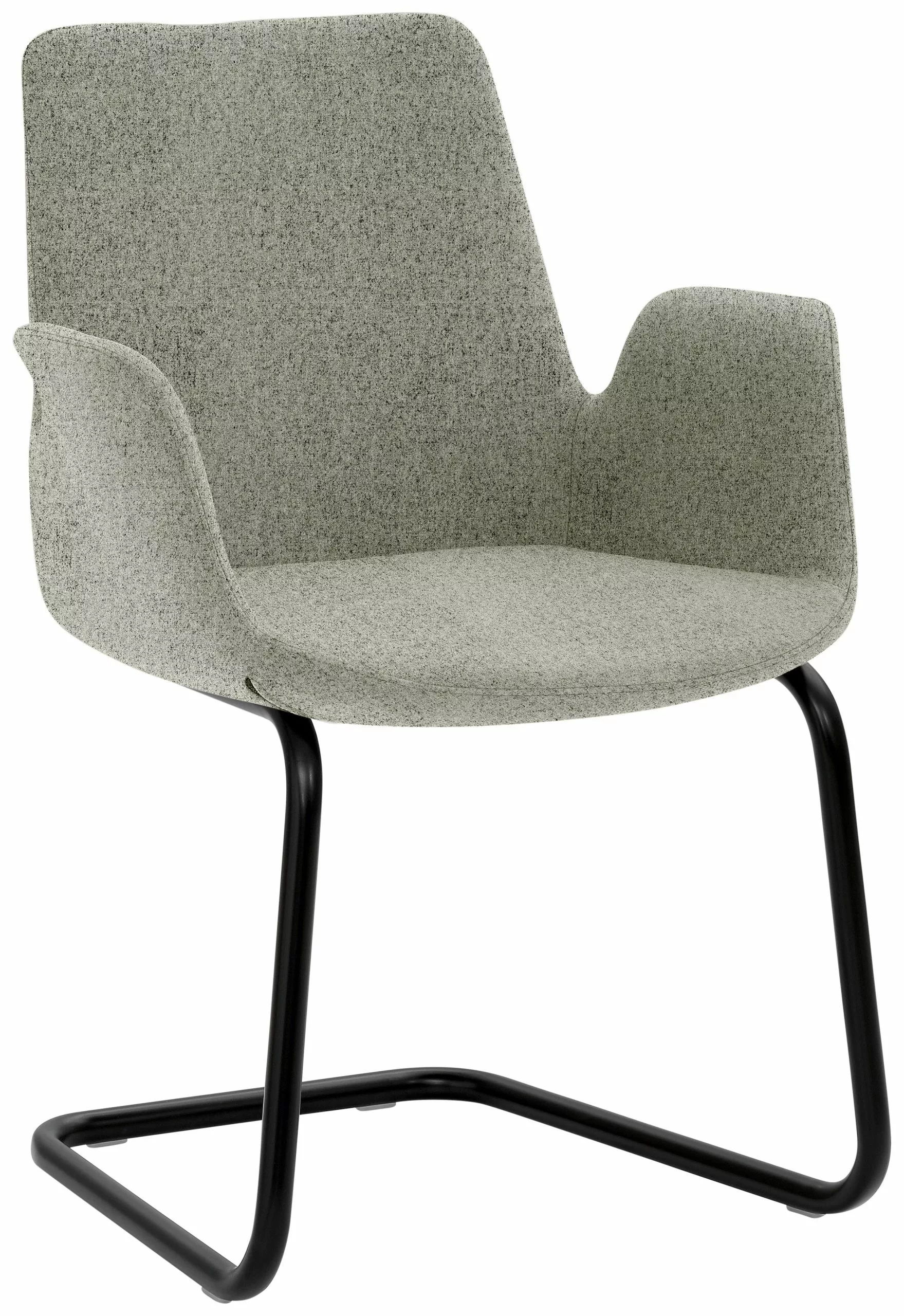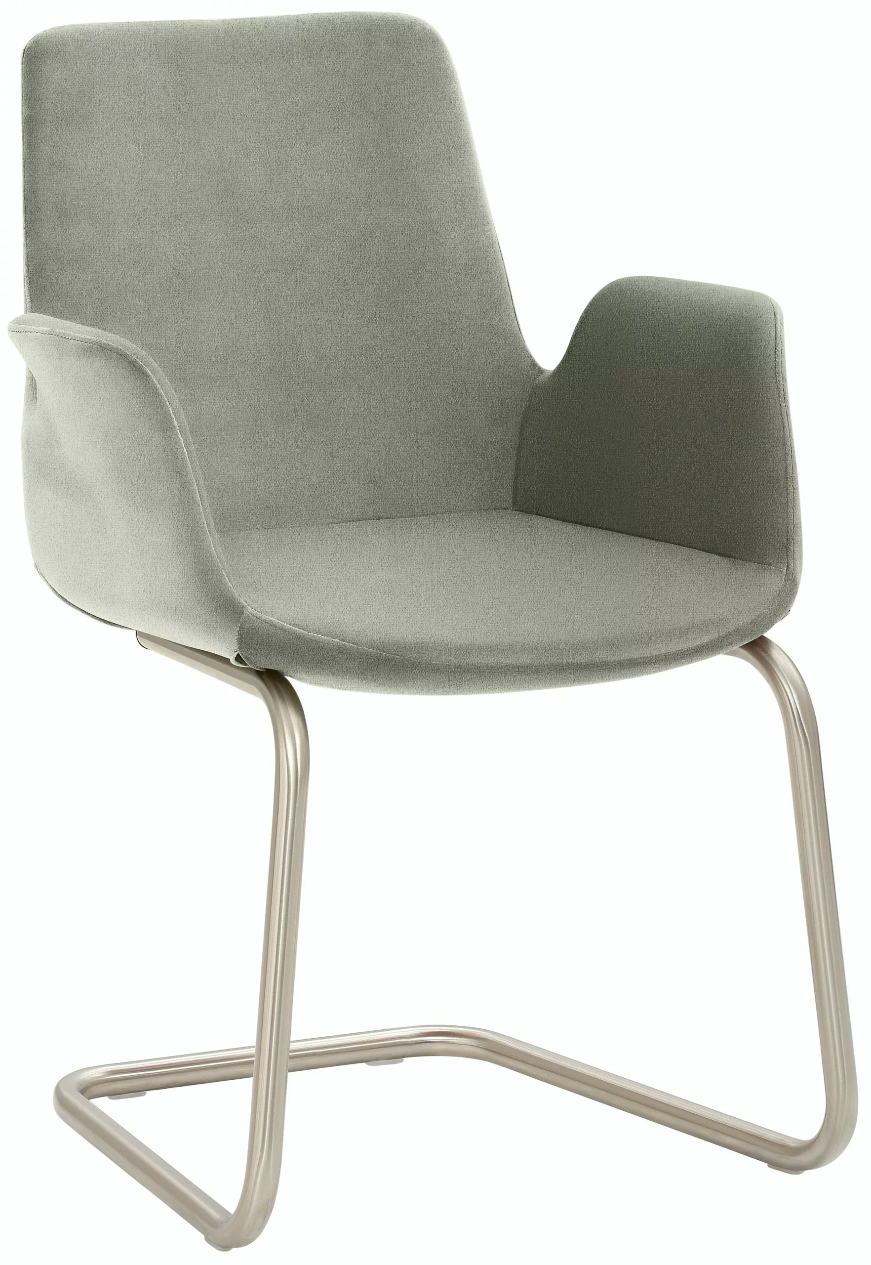 Freischwinger-Gestell, Chrom gebürstet Edelstahllook, mit integrierten Armlehnen, rundum gepolstert, Sitzhöhe 49 cm.