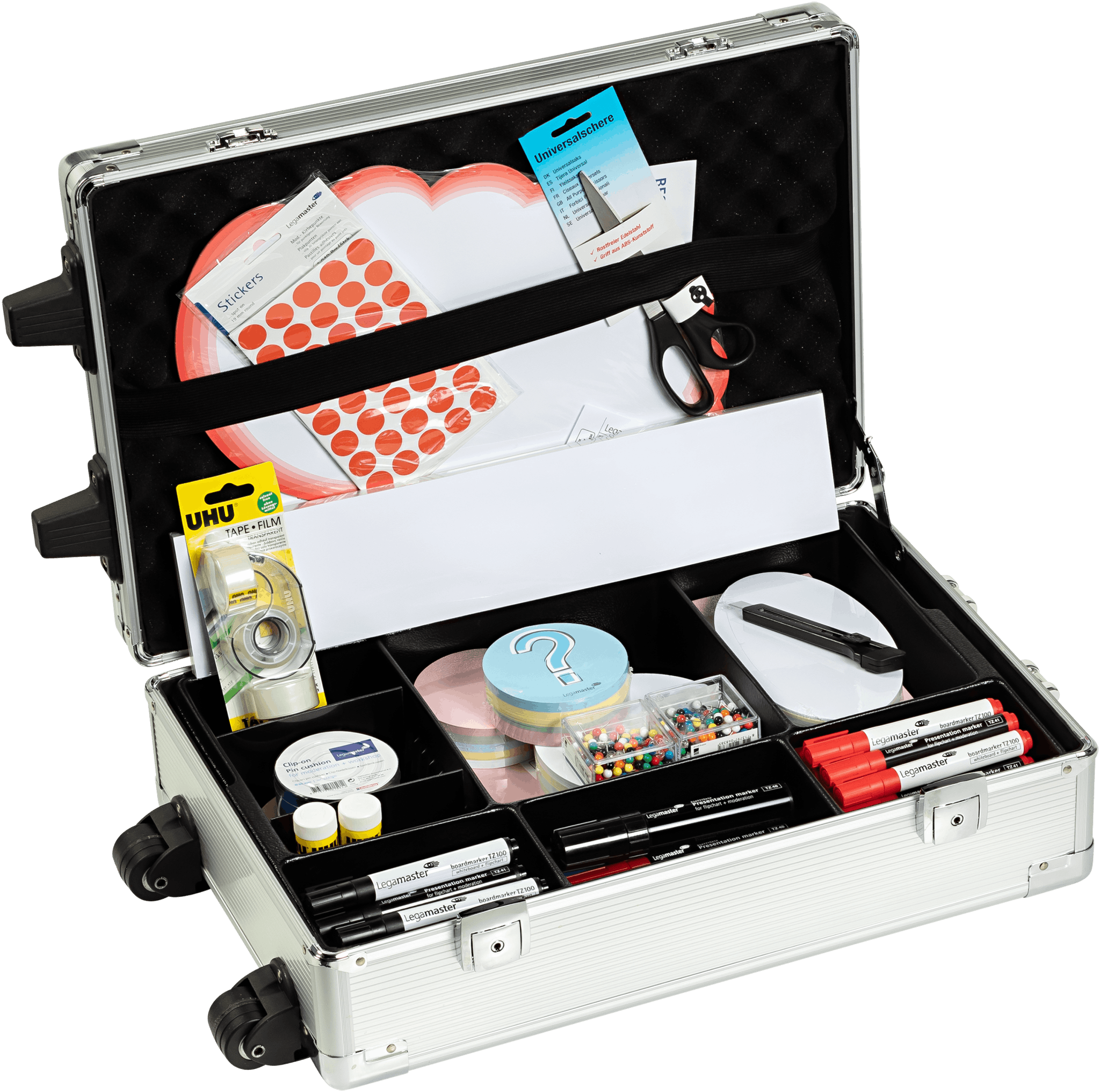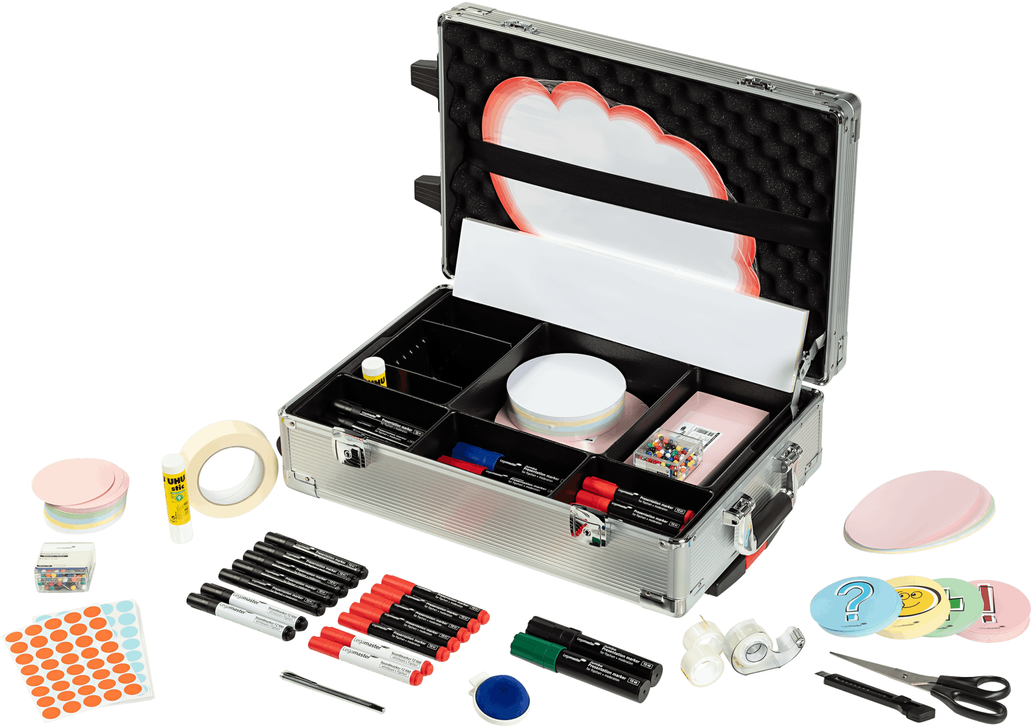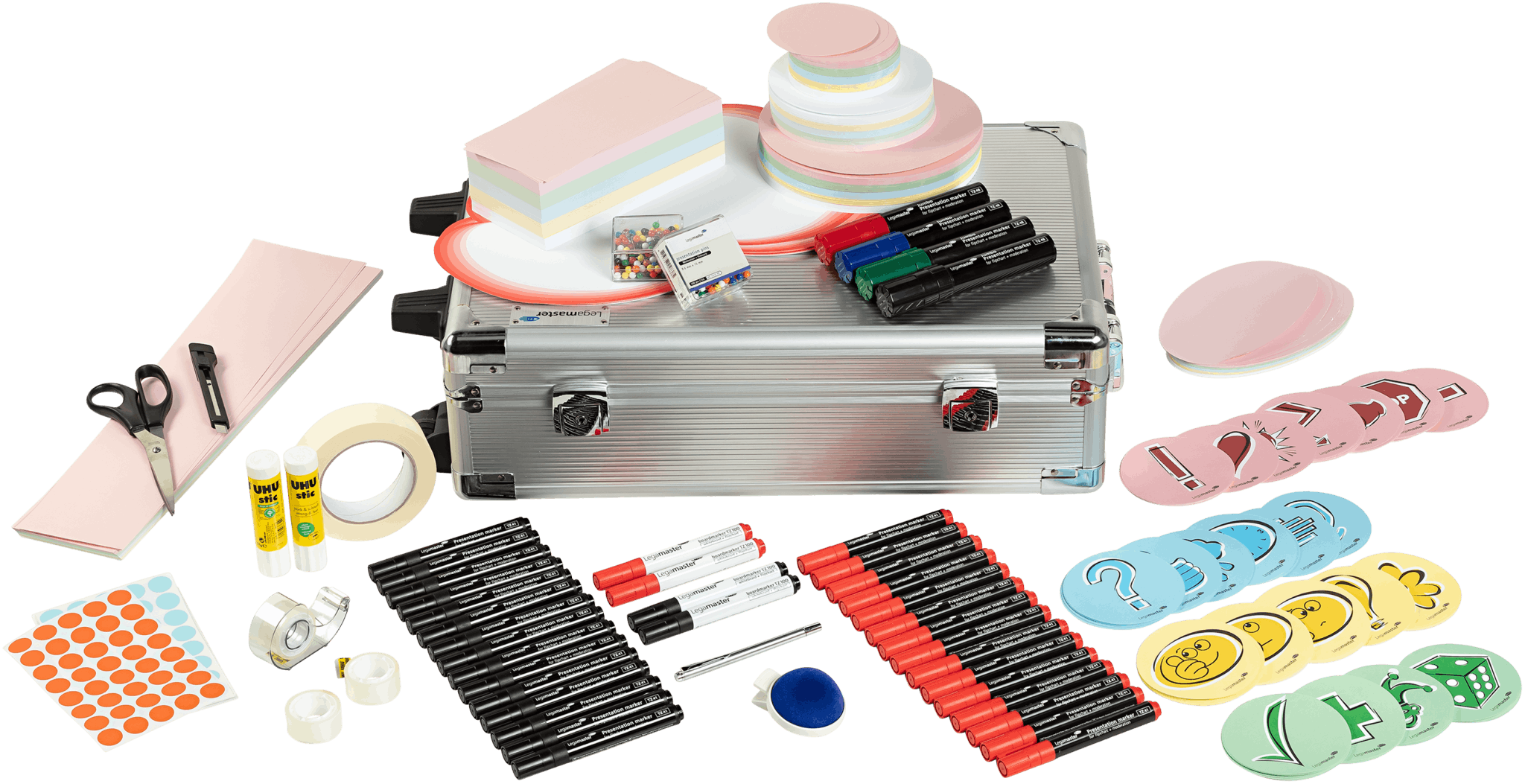 Inhalt: 1 Flyer Tipps & Tricks, 500 Rechteckkarten, 9,5 x 20 cm farbig sortiert (freie Farbauswahl nicht möglich), 250 Kreise, Ø 9,5 cm farbig sortiert (freie Farbauswahl nicht möglich), 250 Kreise, Ø 14 cm farbig sortiert (freie Farbauswahl nicht möglich), 250 Kreise, Ø 19 cm farbig sortiert (freie Farbauswahl nicht möglich), 100 Ovale, 11 x 19 cm farbig sortiert (freie Farbauswahl nicht möglich), 250 Moderationskarten Emoticons, je 15 Präsentations-Marker TZ 41 (schwarz, rot), 4 Jumbo Präsentations-Marker TZ 48 (1 x schwarz, 1 x rot, 1 x blau, 1 x grün), 400 Moderationsnadeln farbig sortiert (freie Farbauswahl nicht möglich), 2 Klebestifte, 20 Moderationswolken 26,5 x 43 cm, 1040 Klebepunkte, Ø 19 mm, (520 x rot, 520 x blau), 1 Clip-Nadelkissen, 1 Bandabroller inkl. 1 Rolle Klebeband, 1 Teleskopzeigestab mit integriertem Kugelschreiber, 4 Boardmarker TZ 100 (2 x rot, 2 x schwarz), 1 Schere, 20 cm, 1 Rolle Abdeckband, 100 Überschriftenstreifen, 10 x 46 cm farbig sortiert (freie Farbauswahl nicht möglich), 1 Cutter, 1 Reserverolle Klebeband.