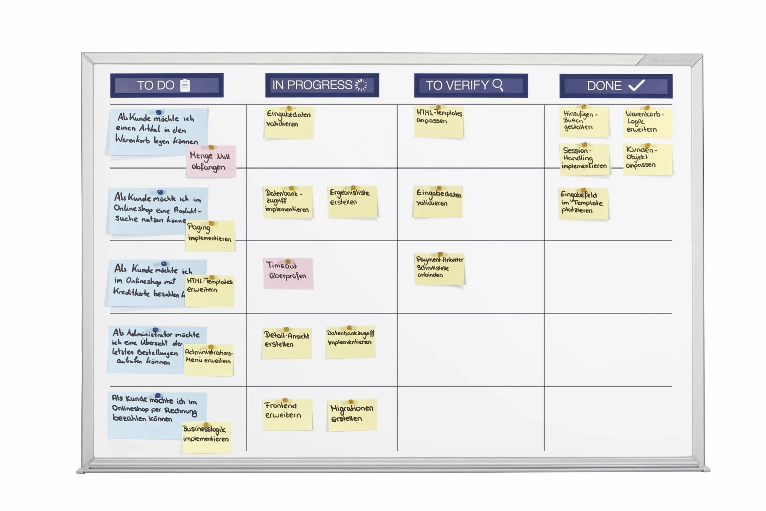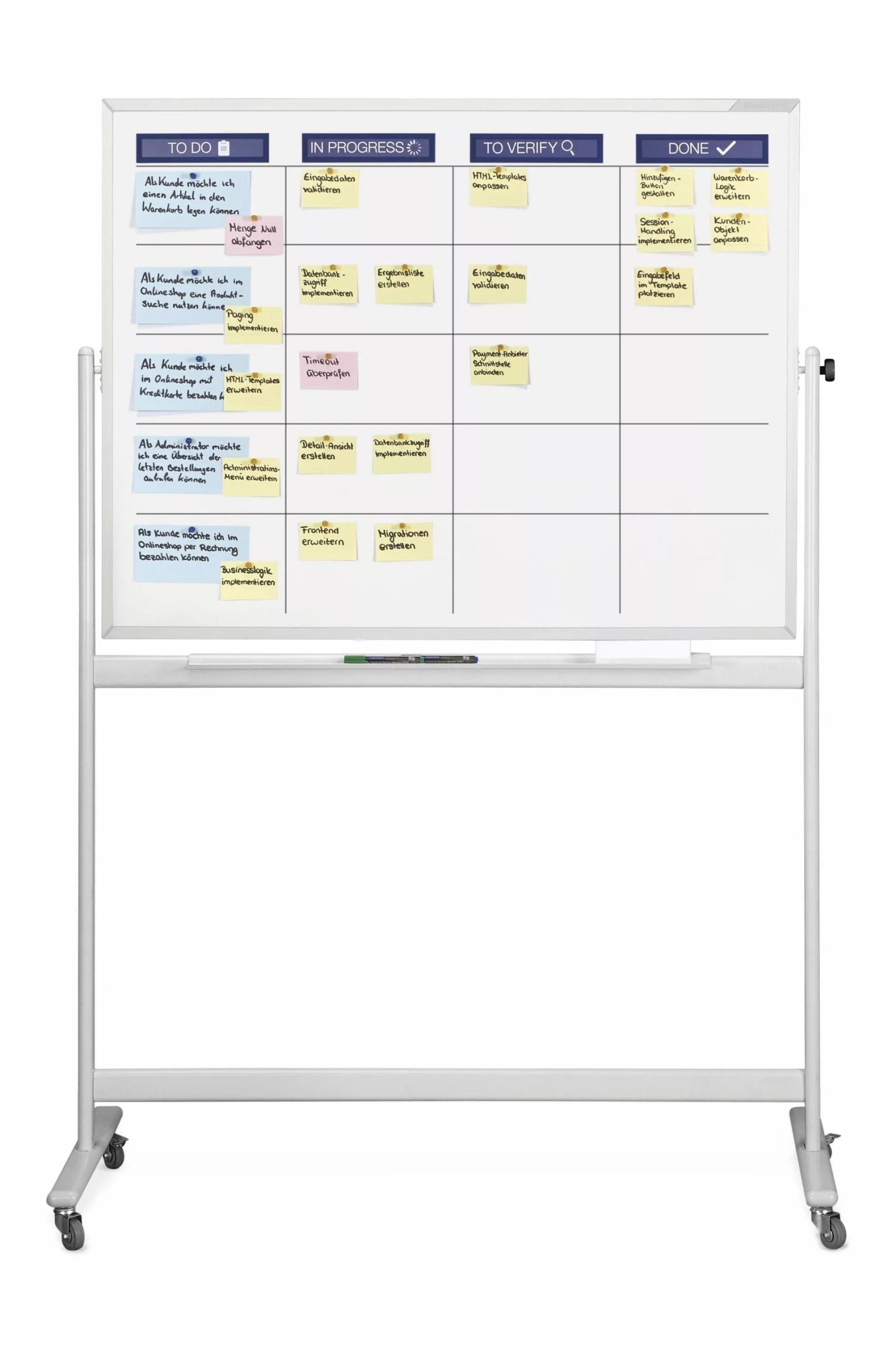 magnetoplan Planungs-Set SCRUM XL mobil, Tafelgröße: 1800 x 1200 mm. Komplexer Workflow, für Teams bis zu 9 Mitgliedern. Das Set unterstützt optimal die Selbstorganisation + Planungsprozesse agiler Projekt-Teams bei Anwendung eines schrittweisen (iterativen) Vorgehensmodells nach Scrum. Der Begriff Scrum wurde ursprünglich aus dem Rugby-Sport entliehenen. Er bezeichnet ein Framework aus nur wenigen Regeln, in dem sich sowohl Software- als auch sonstige Entwicklungs-Projekte effizienter + erfolgreicher umsetzen lassen. Die durchdachte Zusammenstellung des Planungs-Sets SCRUM liefert Teams die vollständige Grund-Ausstattung. So kann direkt in die Arbeit mit dem Scrum Board eingestiegen werden. Das im Set enthaltene, magnethaftend + beschreibbare Whiteboard bildet die ideale Grundlage für die agile Planung nach Scrum. Die Vorteile des Scrum Boards im Überblick: Visualisierung des gesamten Workflows in Form einzelner Arbeits-Schritte Individuell anpassbar an die speziellen Anforderungen des aktuellen Projekts Durch den Einsatz magnethaftender + teilweise wiederverwendbarer Materialien wird Agilität im Planungsprozess optimal unterstützt Die Darstellung von User Stories, Aufgaben (Tasks) im Workflow sowie deren Zuständigkeiten lässt alle Beteiligten jederzeit den Fortschritt der aktuellen Arbeitsprozesse (Iteration/Sprint) erkennen Die räumliche Nähe und direkte Kommunikation der Team-Mitglieder am Scrum-Board fördert ein effektives miteinander Agieren sowie den Spaß an der Team-Arbeit Für den direkten Einsatz empfehlen wir die magnetoplan Scrum Board-Sets Lieferung inkl. Whiteboard (zur Wandmontage oder mobil) sowie entsprechendem Zubehör Set-Inhalt Standard: 10 x magnetofix-Magnetrahmen TOPSIGN in blau (A5quer/A4 hoch). 3 x Zeichenband selbstklebend, 2,4 mm. Je 250 Kommunikationskarten rechteckig, gelb, rosa, blau. 4 x Board- und Flipchartmarker PRO+, farblich sortiert. 56 x Memohalter gelb. 8 x Memohalter blau. 1 x Tafelreiniger (250 ml). 1 x Tafellöscher PRO+, magnethaftend. 1 x Papierschere. Geeignet für Teams bis zu 9 Mitgliedern – komplexer Workflow Empfohlene Spalten: 4 – 6 Mindest Spaltenbreite: 30 cm Empfohlene Story Bahnen: bis zu 9 Empfohlene Bahnenhöhe: 15 cm.
