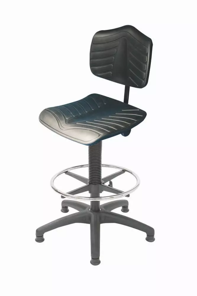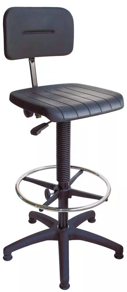 Die Sitzhöhe ist stufenlos einstellbar. Die Belastbarkeit beträgt 110 kg. Der Fußring lässt sich in der Höhe einstellen und ermöglicht entspanntes Arbeiten.