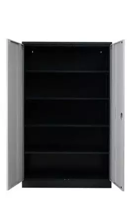 Der Stahlschrank ist komplett aus Metall gefertigt. Die Oberflächen sind aus elektrostatisch pulverbeschichtetem Metall hergestellt und dadurch besonders robust. Die vier Fachböden sind in 5 cm Abständen in der Höhe verstellbar. So bietet der Metallschrank auf insgesamt fünf Ordnerhöhen reichlich Stauraum. Der Schrank ist zusätzlich abschließbar und es werden zwei Schlüssel mitgeliefert.
