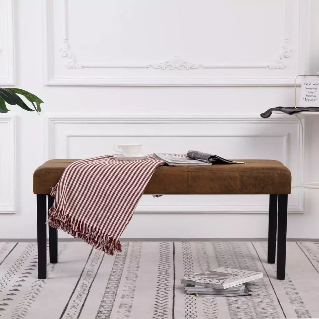 Sie verfügt über einen langlebigen Holzrahmen und ist mit Kunstleder bezogen, das sich leicht reinigen lässt. Darüber hinaus wird die dick gepolsterte Oberseite ganz bestimmt für optimalen Sitzkomfort sorgen. Somit wird die Bank schnell zu Ihrem Lieblingsplatz zum Entspannen.